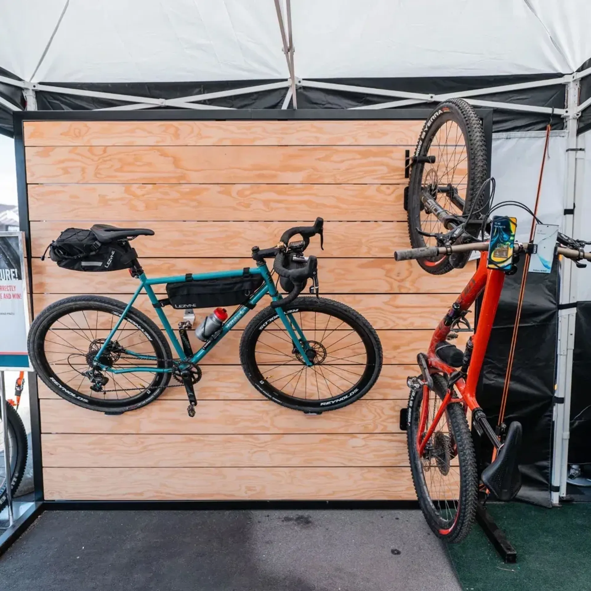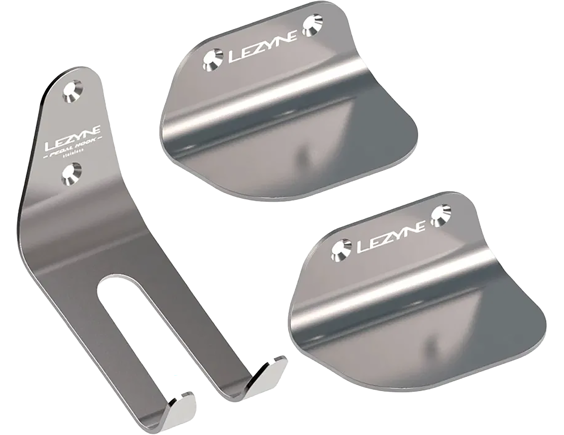 Modern, industrial 3-piece pedal-hook bicycle storage system constructed from a durable, corrosion-resistant stainless steel. This includes a stylish wall-mounted pedal hook and tire plates to prevent scuffing.