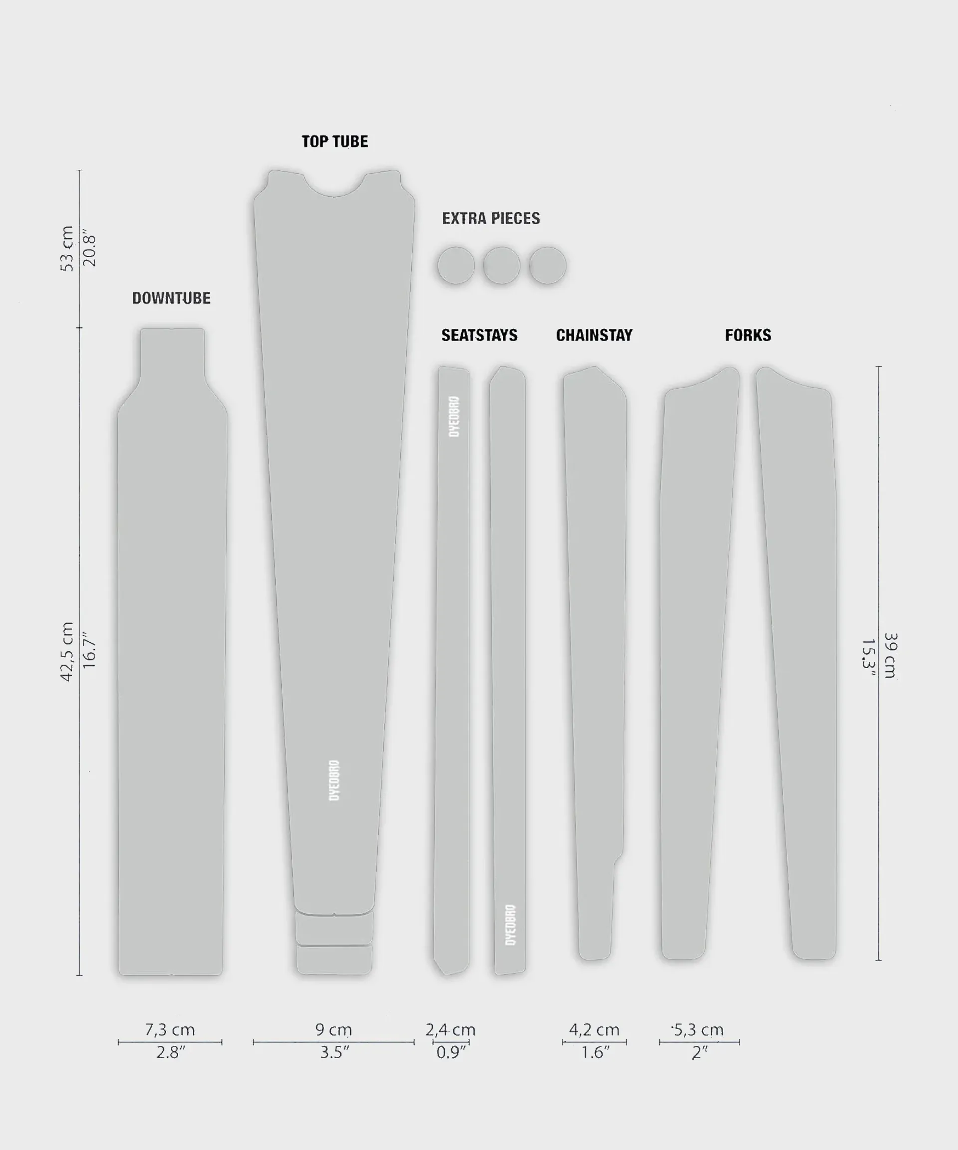 The kit is designed to protect the frame top tube, down tube, forks, seatstays, and chainstay with 12 pieces in total.
