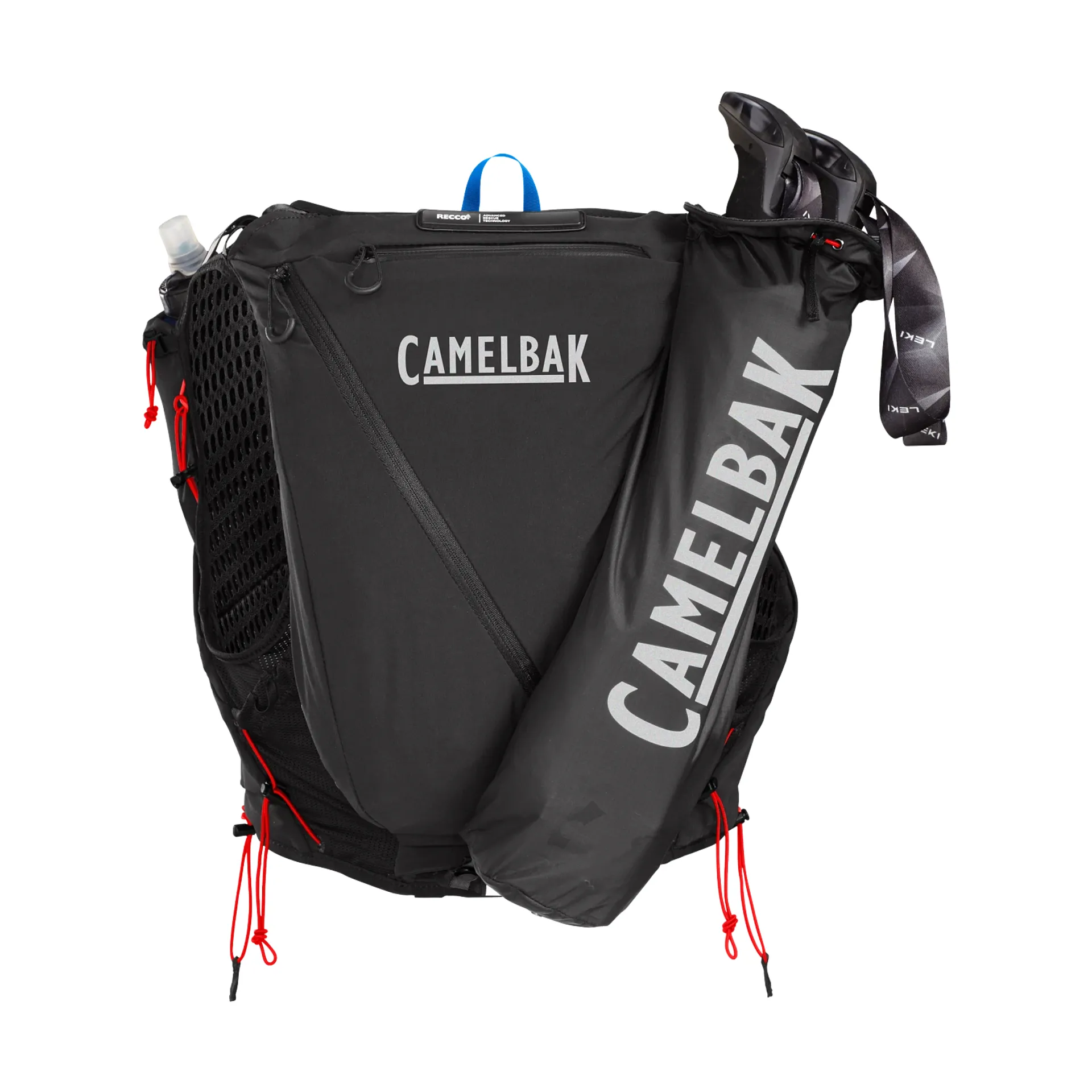 RECCO® technology makes the wearer searchable by rescue teams, providing peace of mind. A deployable and fully removable trekking pole quiver allows for adaptation to changing terrains, while the water-resistant zippered pocket keeps essentials safe and dry. Stretch overflow pockets and secure phone storage provide space to refuel and stay hydrated. The vest includes dual adjustable chest straps, a safety whistle, a tube trap, a key clip, and reflectivity for visibility.