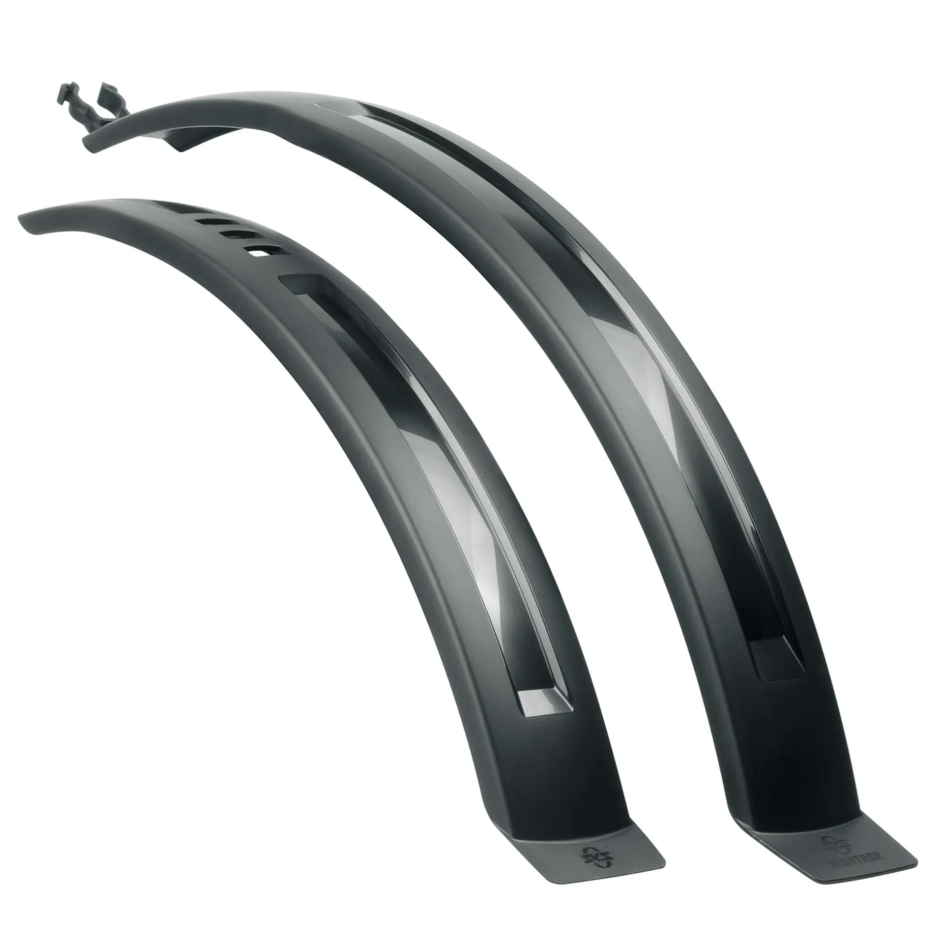 Following a design update, the Hightrek clip-on mudguard set impresses with its sporty look. The mudguard set is particularly suited for trekking or city bikes with 26″ to 28″/700c tyres and can be installed with seat tube diameters of 28 to 32 mm. The well-thought-out universal fastener and clip enable the mudguard to be mounted and removed quickly without any tools.