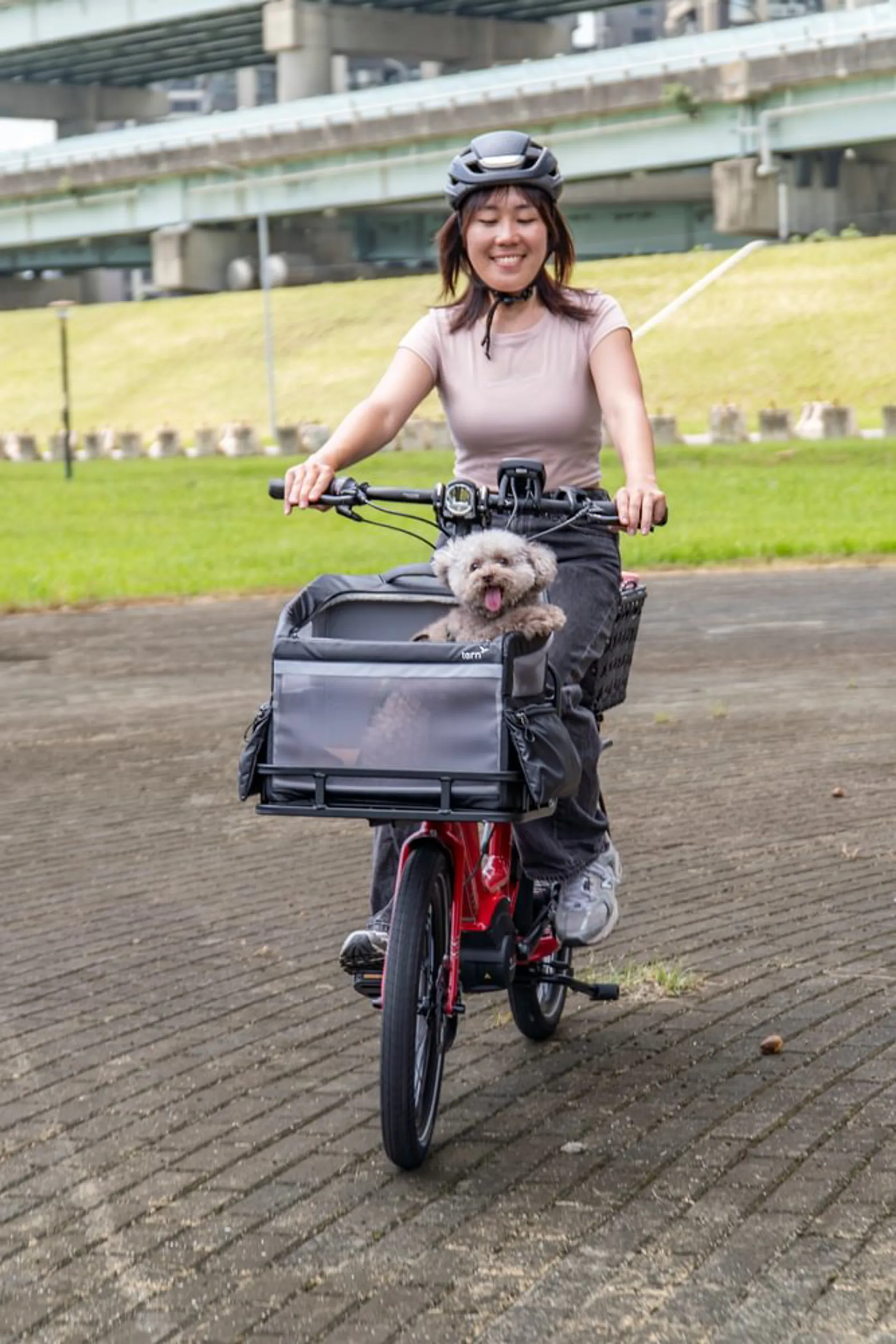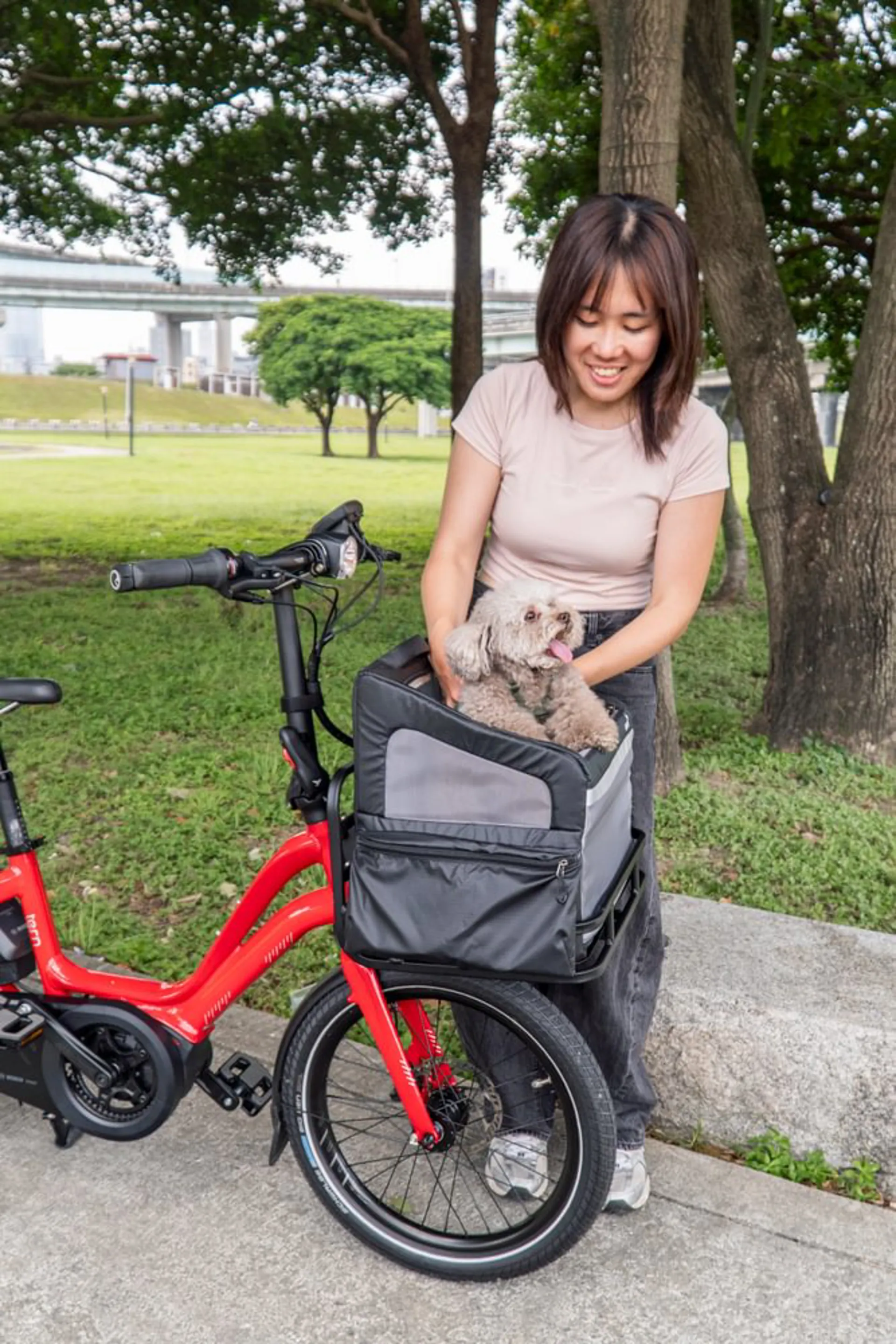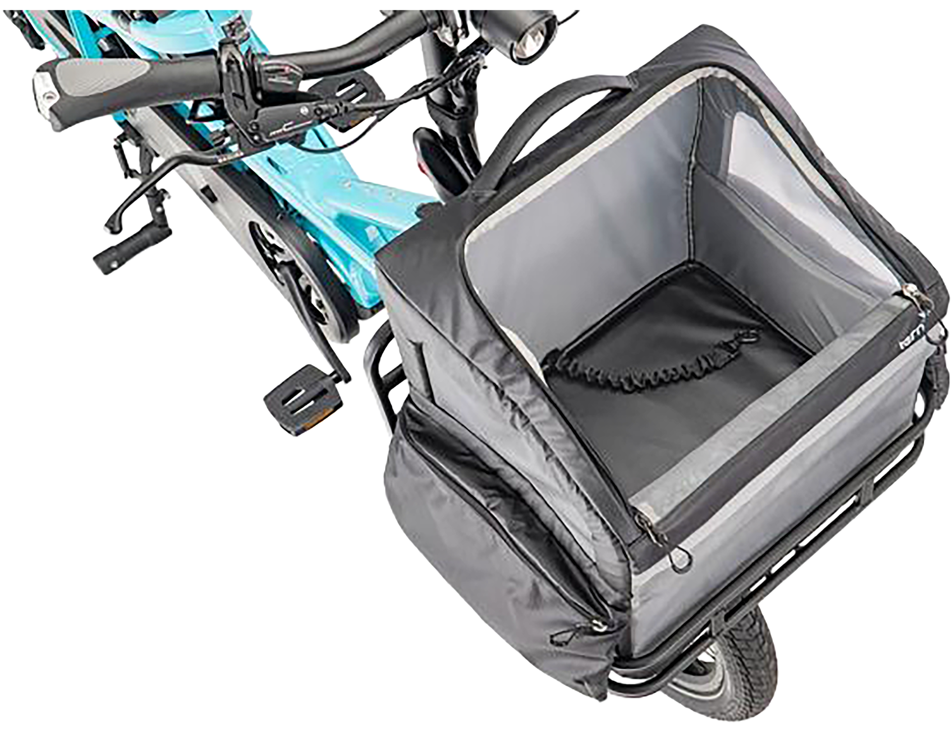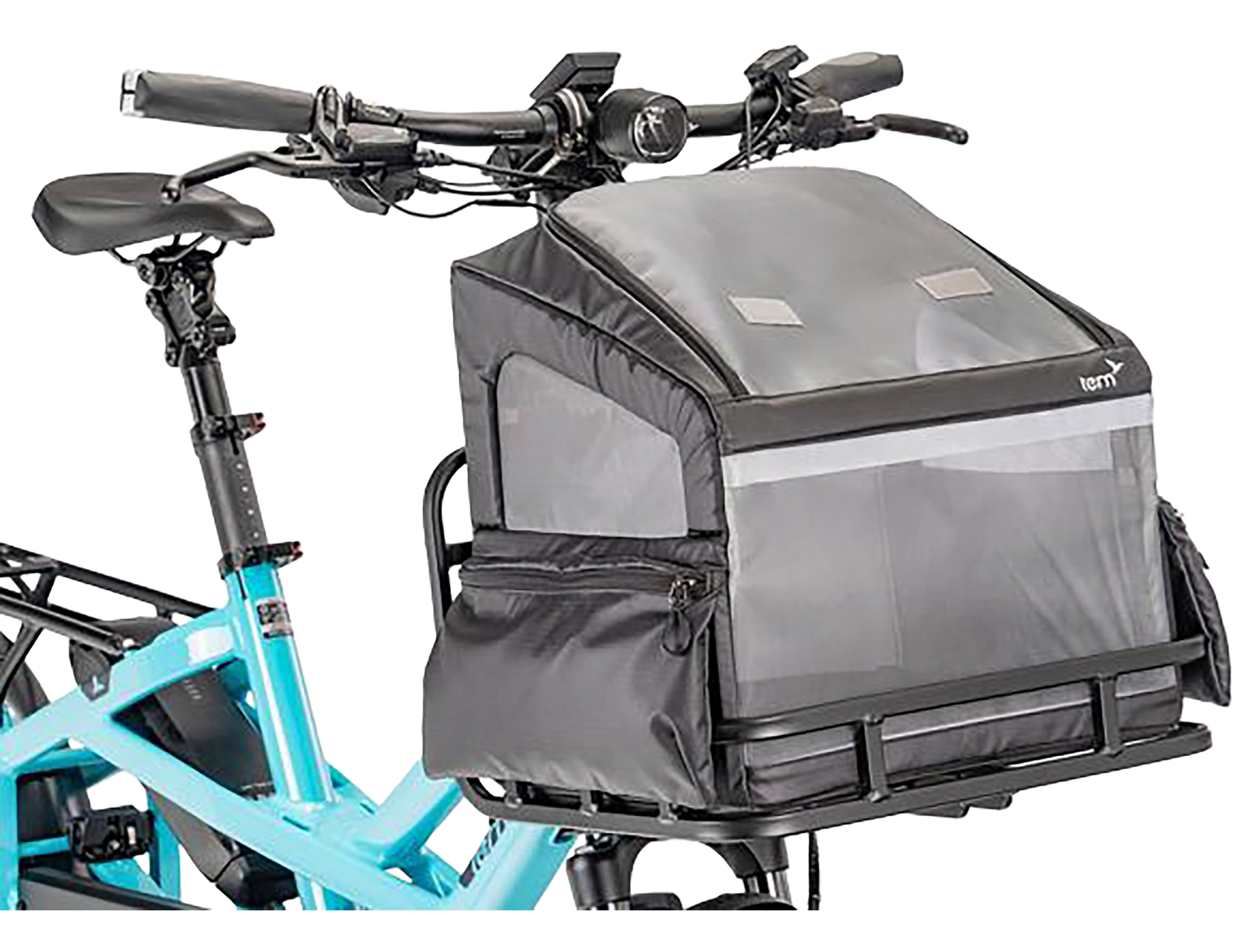The RuffHouse is a well-ventilated pet carrier for small dogs that attaches securely to the Transporteur Rack in seconds. It has a zippered roof, safety tether, and mesh panels for airflow, keeping the dog secure while enjoying the ride. For added convenience, the RuffHouse includes a removable, easy-to-clean tray, side pockets for essentials, and a reflective strip for extra visibility. It’s a must-have for pet owners who love bringing their furry friend along.