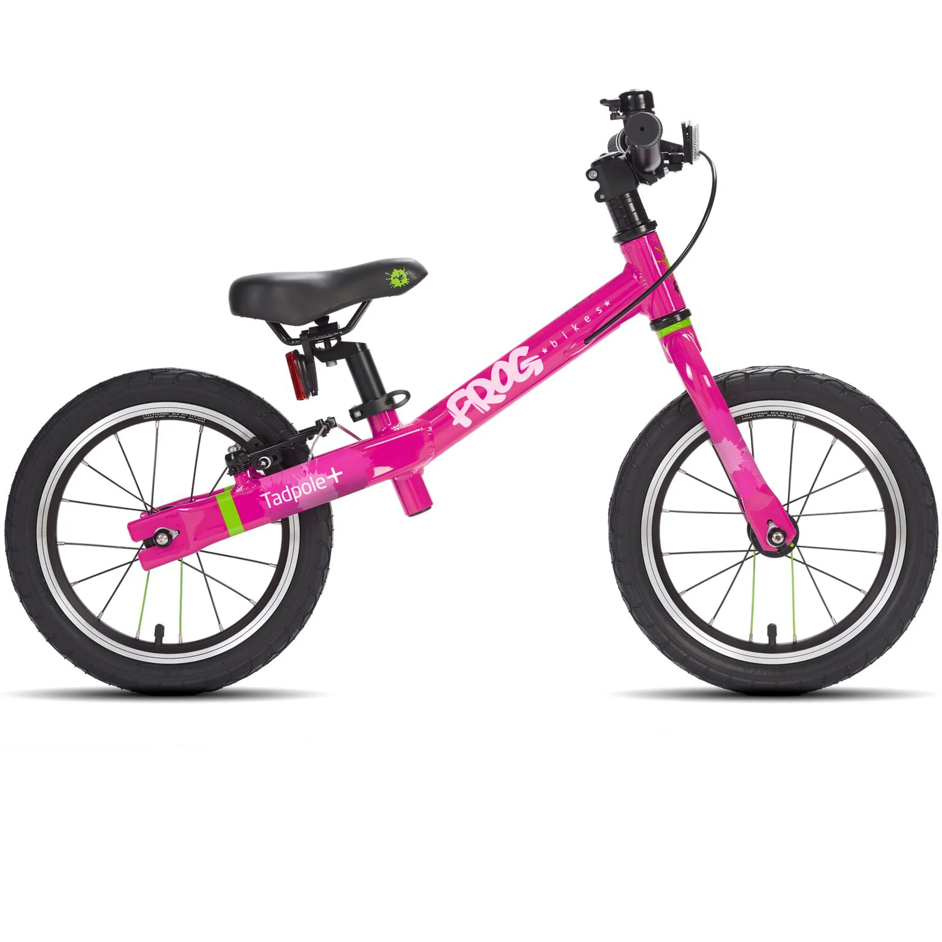 This is a bright candy pink colour option. The Tadpole Plus is suitable for children aged 3 and 4 with a average inside leg of 38cm. Wheel Size: 14" inch.