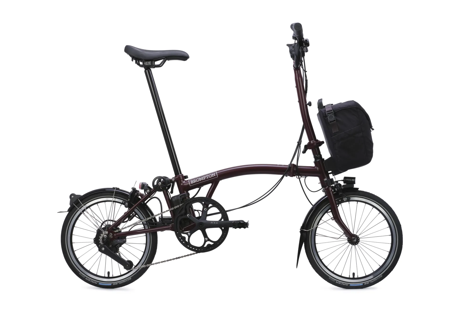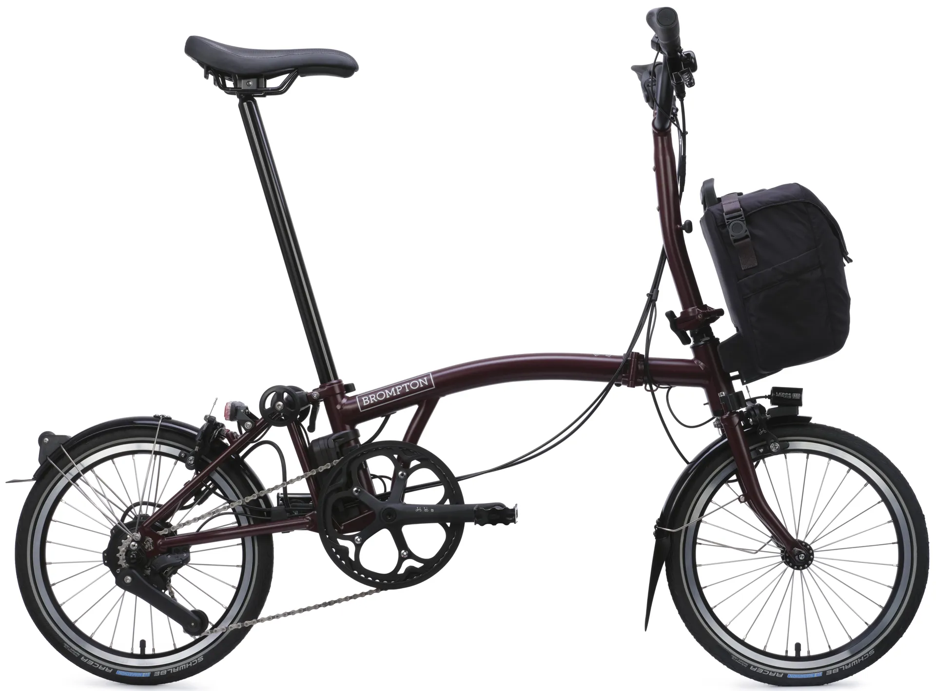 - Saddle:Brompton saddle, integrated carry handle, mounts for Brompton rear light and saddle bag