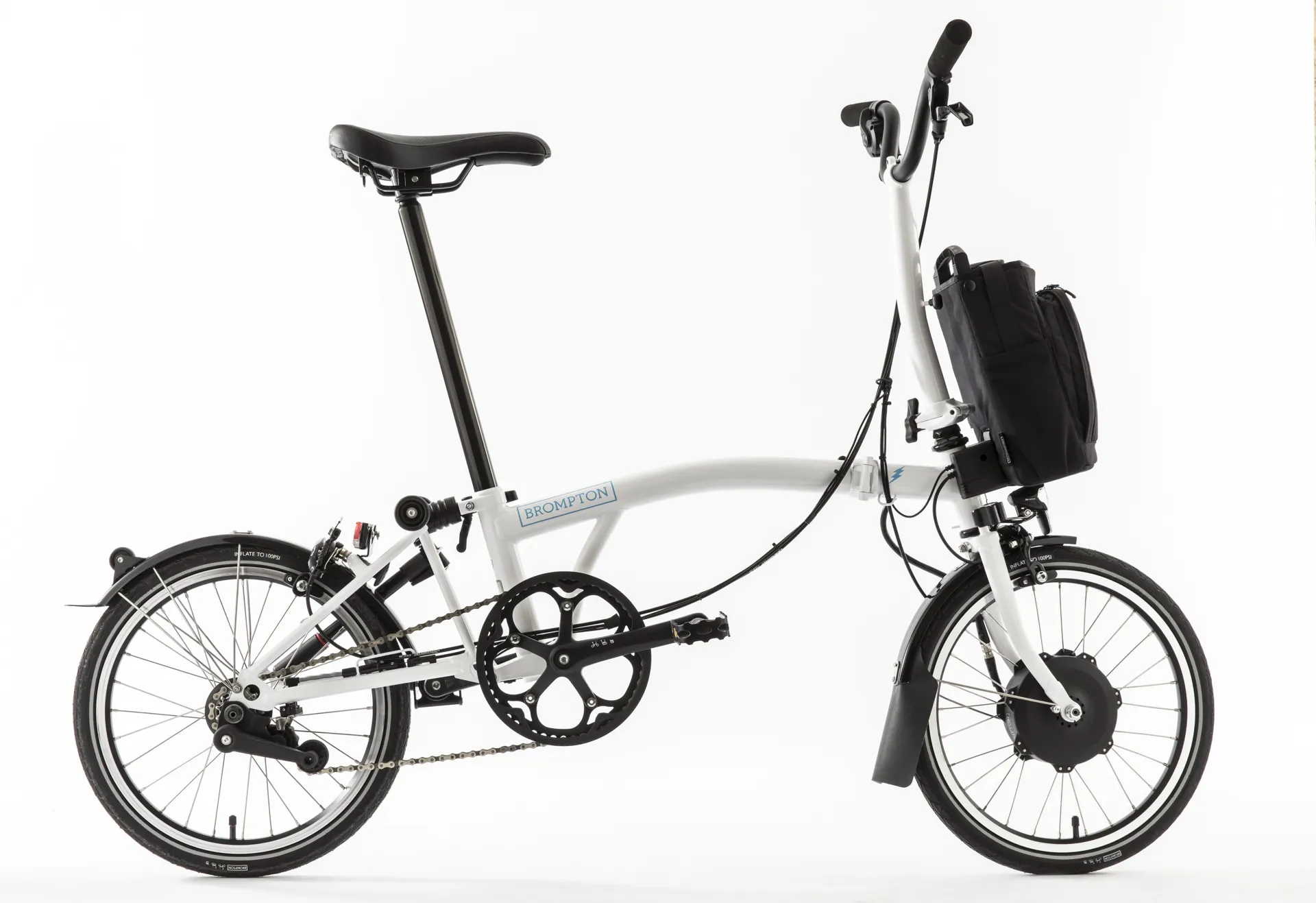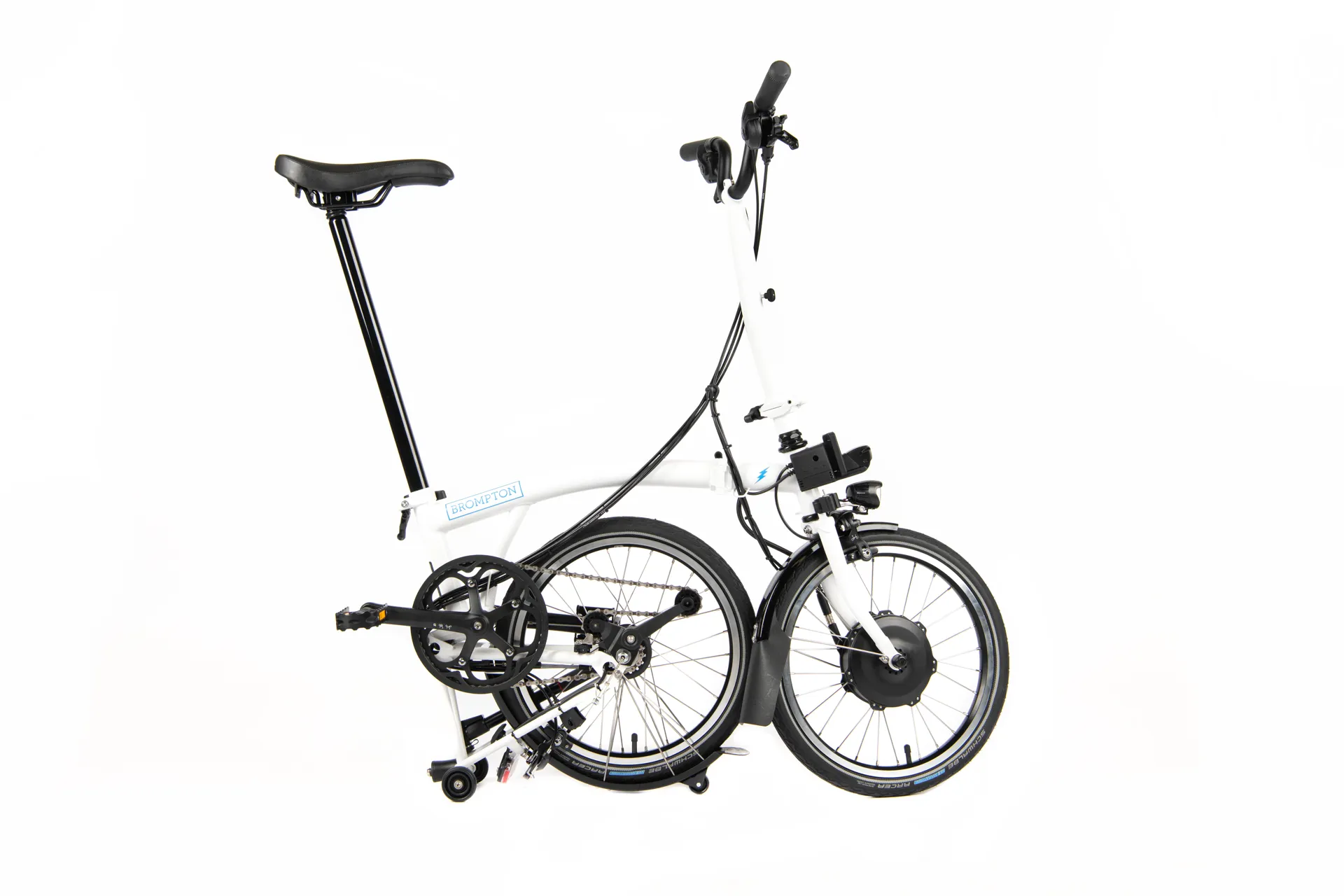 The Electric Brompton M2L Folding Bike, hand made in London, is the perfect city commuting bike when you want to sometimes use public transport or just are stuck for space in your home or office to store your bicycle.