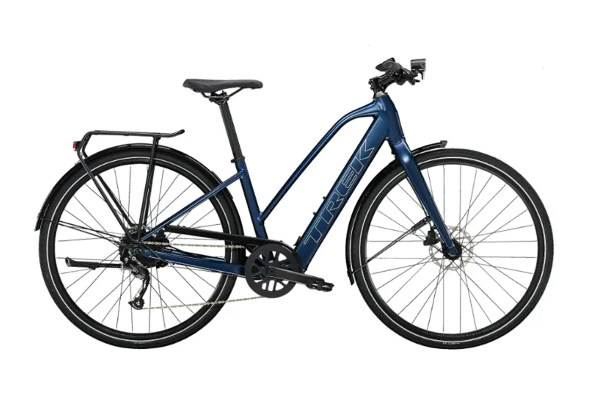 You get a lightweight aluminium frame with a stagger design that makes it easier to hop on and off, Trek's proprietary pedal-assist system with a hub motor (250 W, 40 Nm) that assists up to 25 km/h and a 250 Wh battery for a range of up to 56 kilometres per charge. Plus, fast 700c wheels, fast-rolling yet stable 40c tyres with reflective sidewalls, a reliable 9-speed Shimano drivetrain, hydraulic disc brakes, integrated lights powered by the battery, a MIK-compatible rear rack, mudguards and a kickstand.