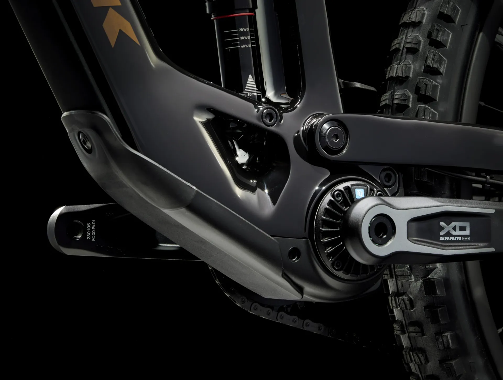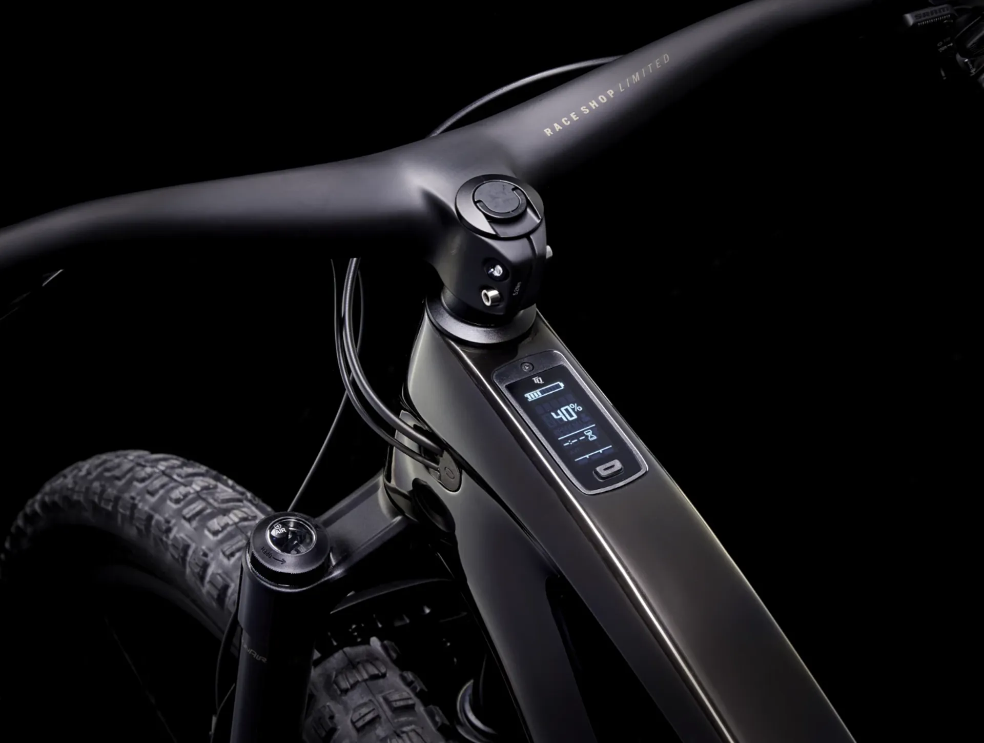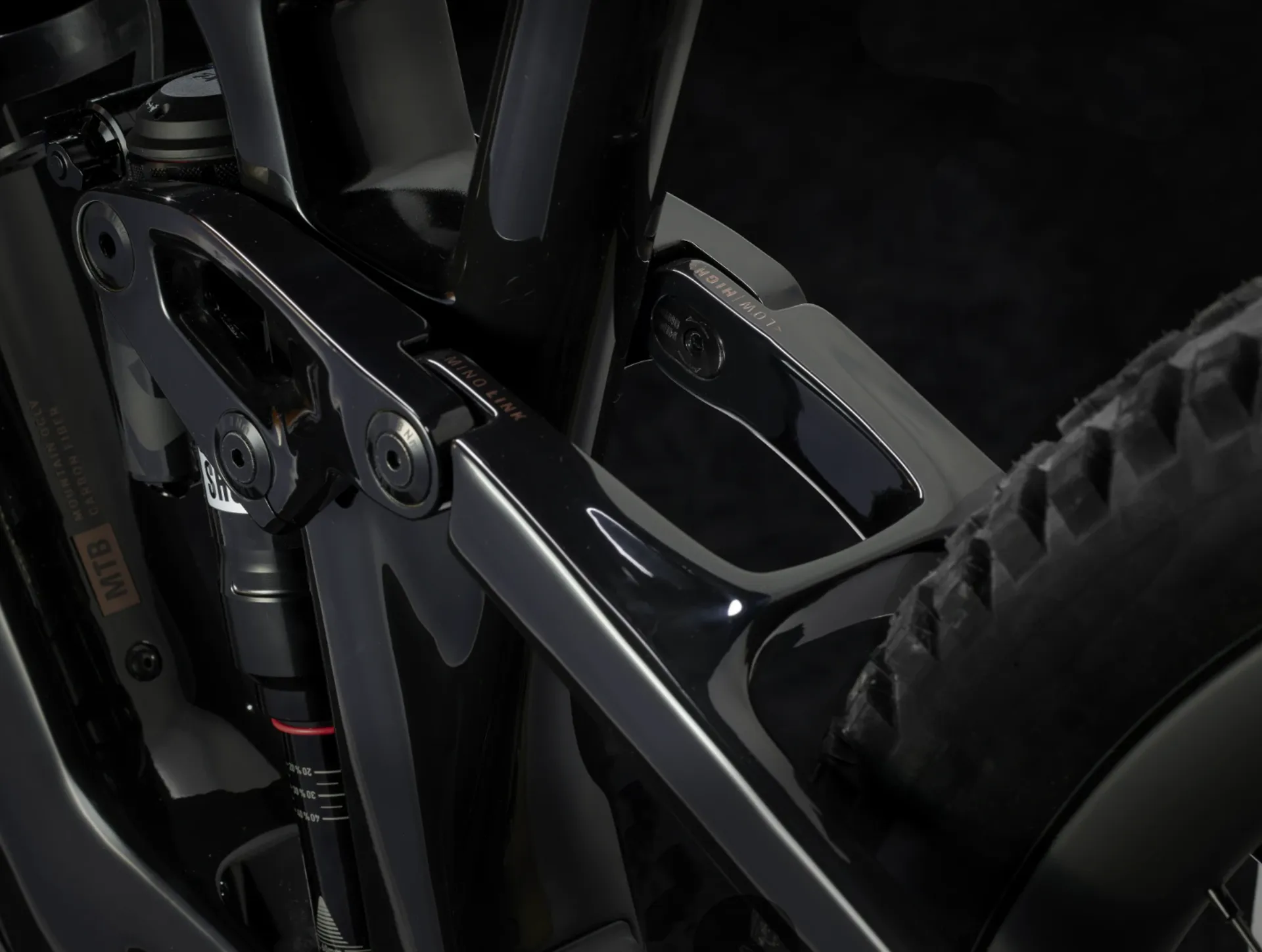 OCLV Mountain Carbon, removable battery, internal routing, alloy rocker link, 34.9 mm seat tube, upper chain guide mount, 55 mm chainline, Mino Link, ABP, Boost148, UDH, 140 mm travel