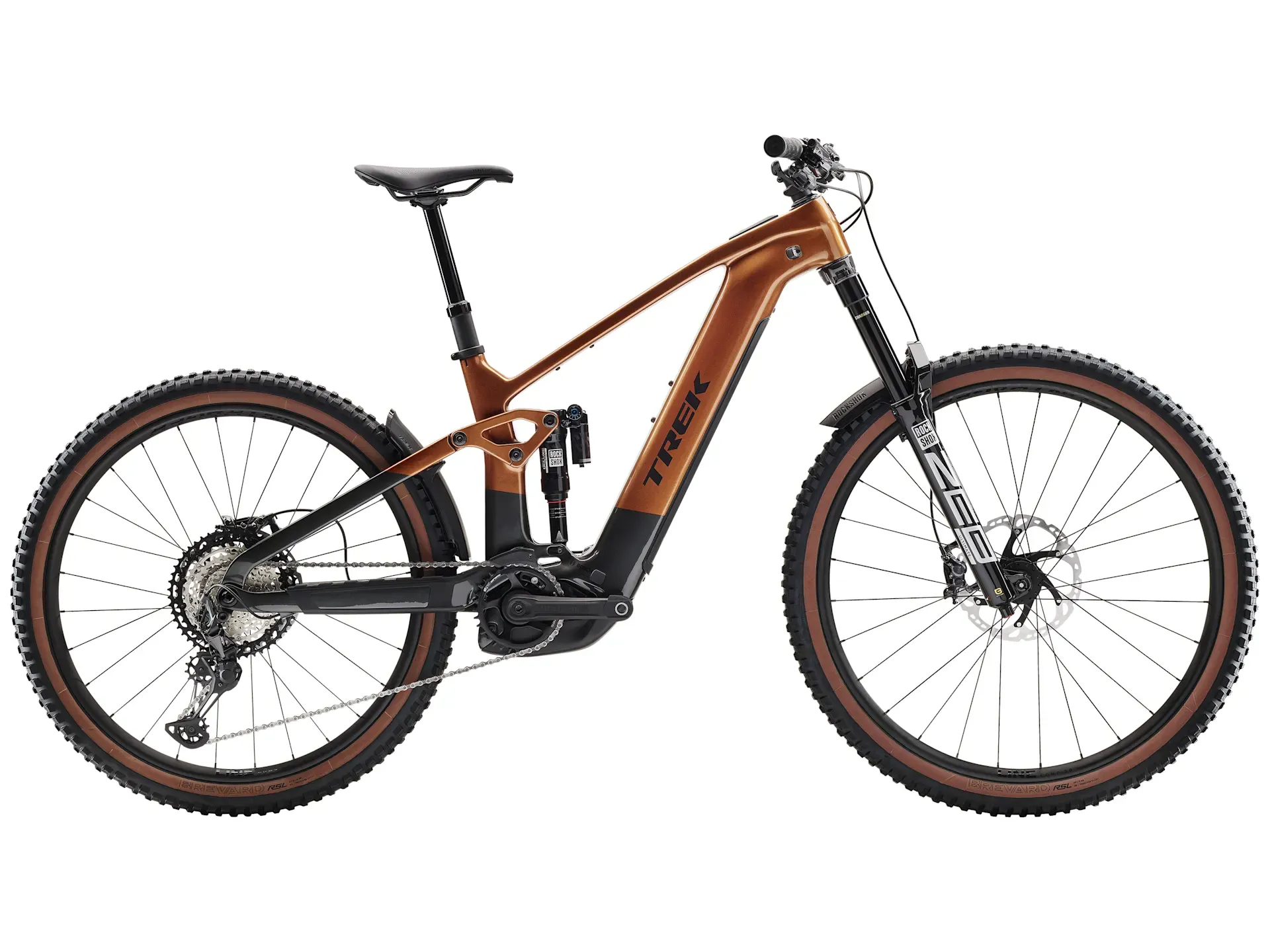 An OCLV Mountain Carbon frame with Bosch Performance CX system (100 Nm, 250 W) and a massive 800 Wh RIB 2.0 removable integrated battery. A 160 mm RockShox ZEB Select+ fork with DebonAir spring and Charger 3 RC2 damper, and RockShox Super Deluxe Select+ rear shock. Tubeless Ready Bontrager Line Comp 30 wheels, a 12-speed Shimano XT drivetrain, 4-piston Shimano XT hydraulic disc brakes and an internally-routed dropper post.