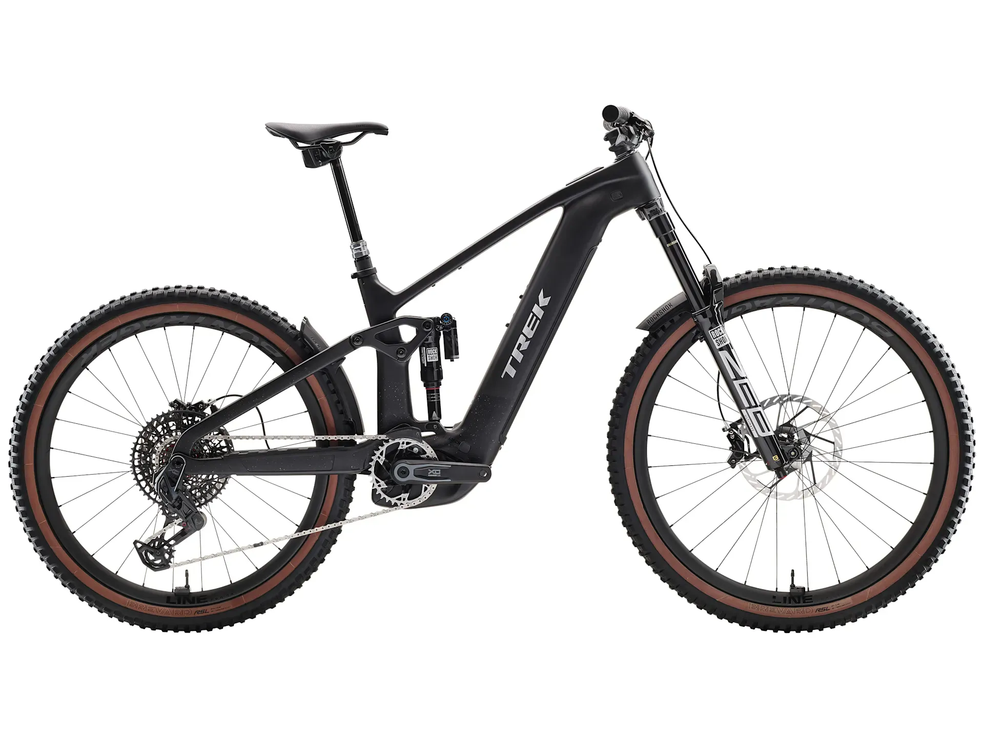 An OCLV Mountain Carbon frame with Bosch Performance CX system (100 Nm, 250 W) and a massive 800 Wh RIB 2.0 removable integrated battery. A 160 mm RockShox ZEB Ultimate fork with DebonAir spring and Charger 3 RC2 damper, and RockShox Super Deluxe rear shock. Tubeless Ready Bontrager Line Pro 30 carbon wheels, SRAM's X0 AXS wireless electronic transmission that shifts clean even under load, plus SRAM Maven hydraulic disc brakes for stopping on a dime and a RockShox Reverb AXS dropper post.