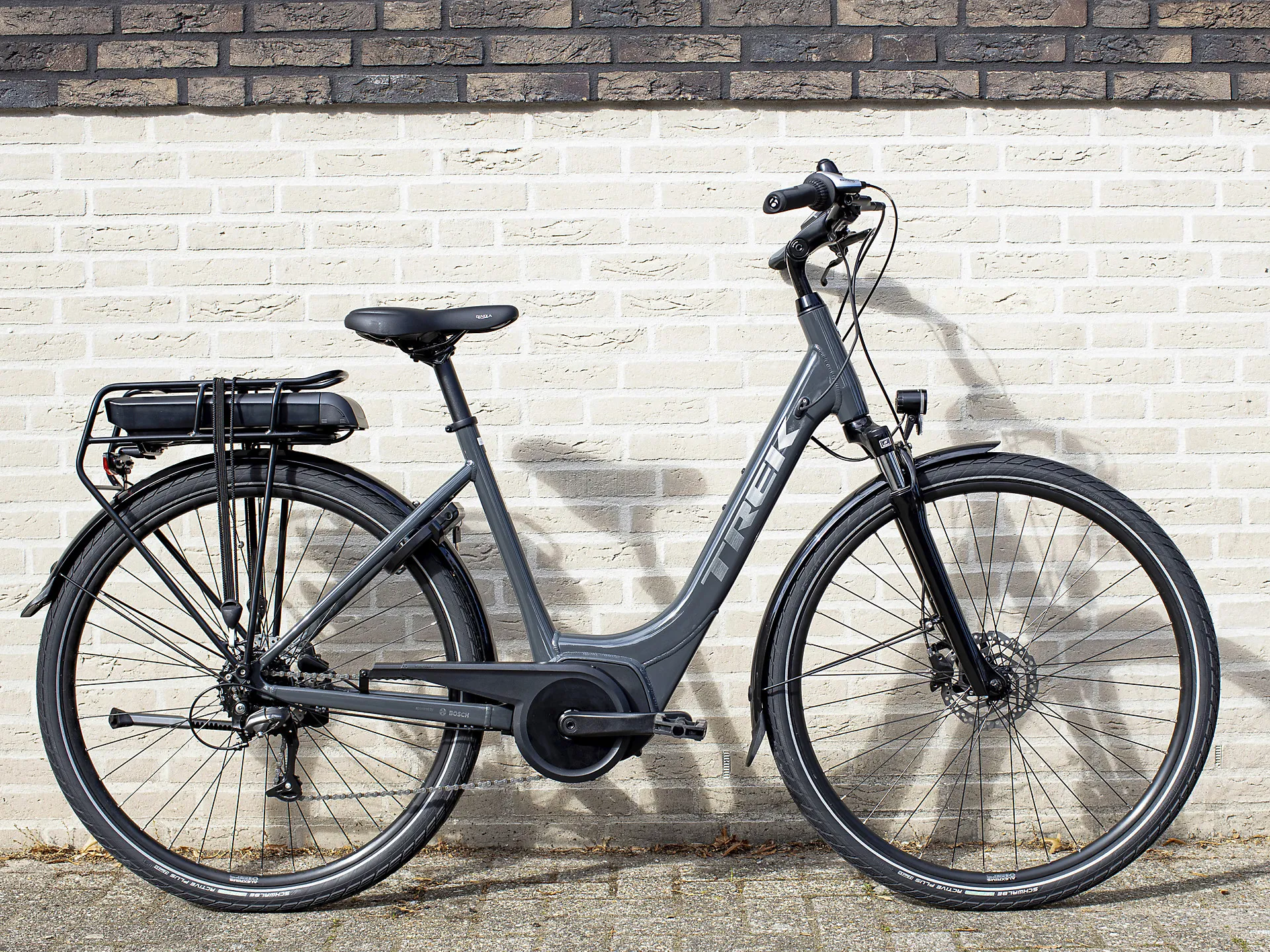 The Verve+ 1 features an 8-speed Shimano drive train, a Bosch Active Line (250 W, 40 Nm) motor, a Purion controller, and your choice of a 300 Wh, 400 Wh or 500 Wh battery. Plus, a 50 mm Suntour NEX suspension fork ideal for absorbing road vibrations for a more comfortable ride, hydraulic disc brakes, an adjustable, Blendr-compatible stem, extra wide 50c tyres for stability and traction, ergonomic grips, mudguards, lights, a rack and a lock. This e-bike also has lowstep geometry, giving you more confidence when mounting or dismounting – even whilst wearing a skirt. Trek e-bikes are quick and smooth, with predictable, easy-to-control power and a long-lasting removable battery that recharges at any household outlet.
