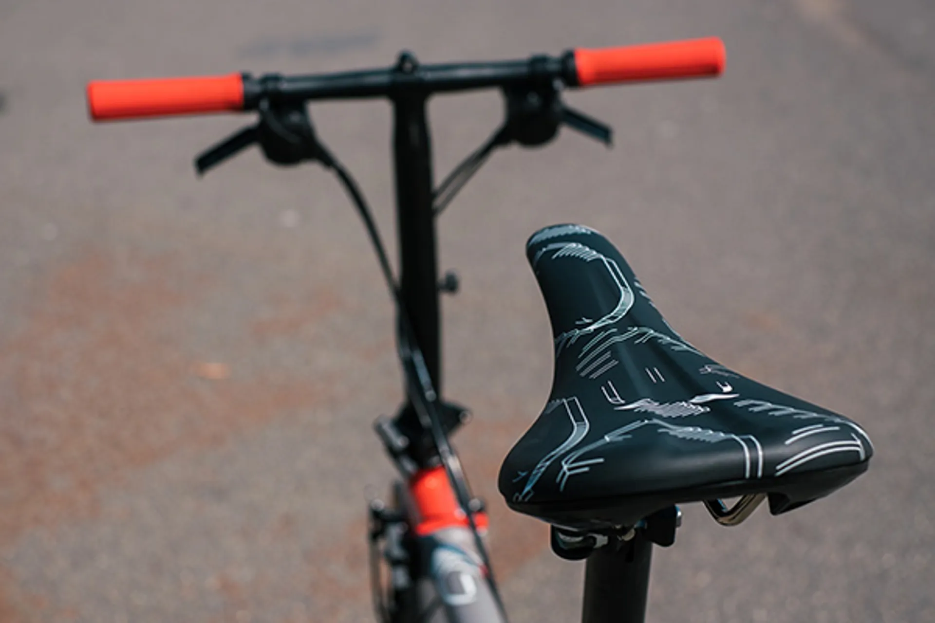 - Saddle: Brompton CHPT3 saddle - Titanium Rails, CHPT3 Print, Fire Red under-nose hand-hold