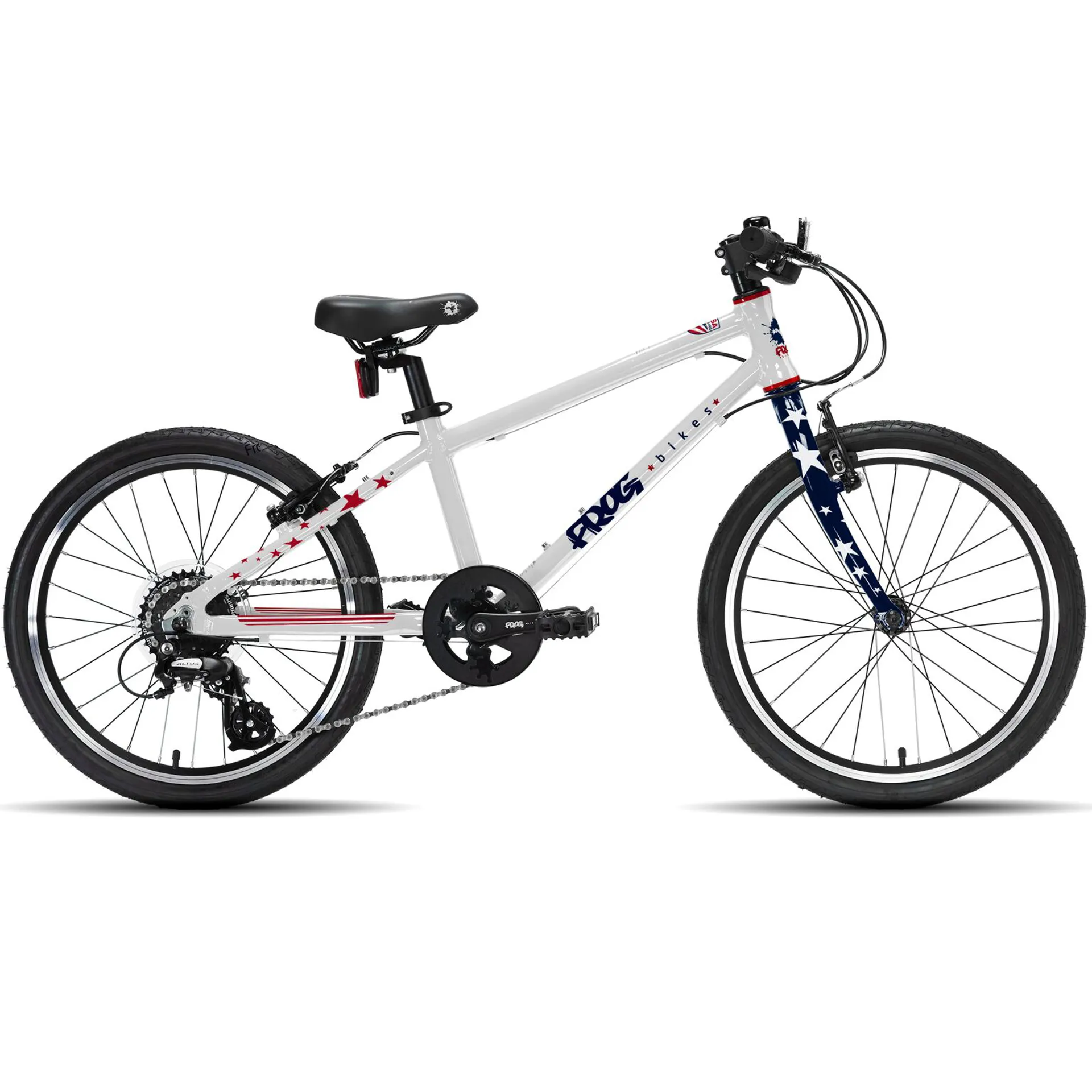 The Frog 55 Hybrid is an ideal 20" wheeled bike for 6 to 7 year olds with an average inside leg of 55cm. This is the USA flag colour version with 8 speeds.