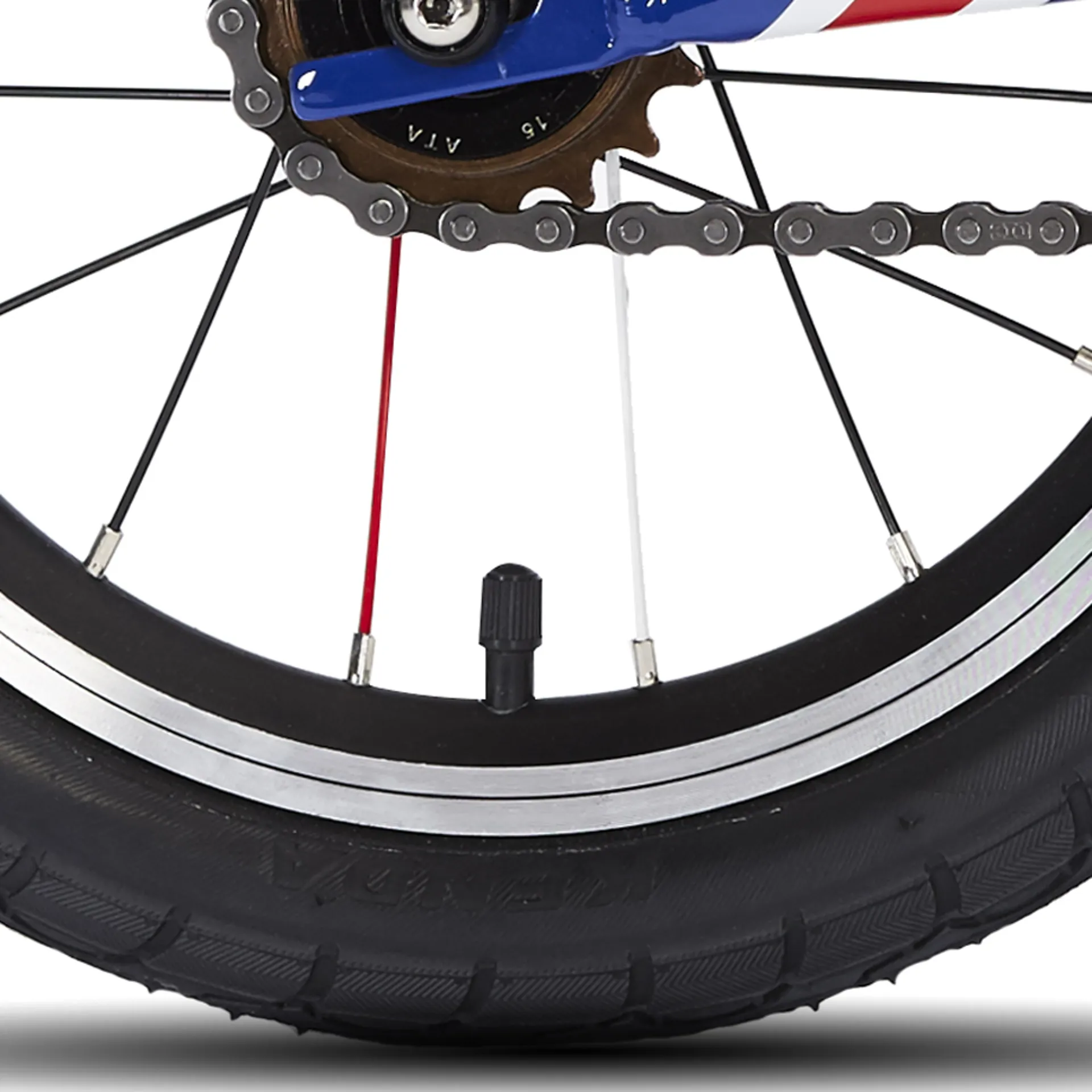 This is a 14" wheel model, featuring hybrid tyres for on and off road use. It has 1 each colour matched red and white spokes on each wheel to match the graphics on the bike.