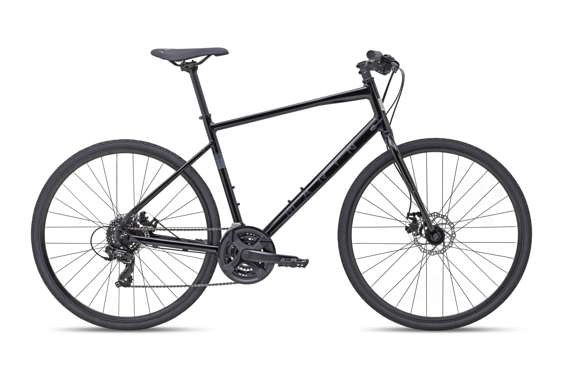 The Fairfax 1 is the most affordable in the collection. Named “Best Hybrid” many years running by Wirecutter it’s built around a lightweight Series 1 aluminum frame and a sturdy CrMo fork and comes with a 3x7-speed Shimano drivetrain, Clark’s mechanical disc brakes and plenty of reliable Marin components