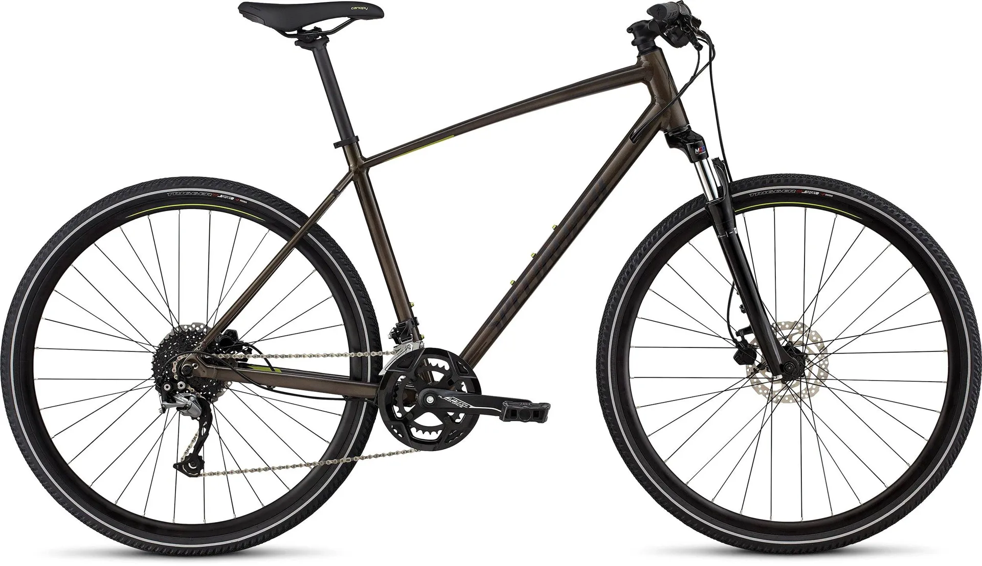 The Specialized CrossTrail Sport is a versatile hybrid designed to cope with the demands of the trail without compromising on speed an comfort. It's equipped with a suspension fork with Specialized's Fitness Brain Technology that can tell the difference between pedalling inputs and trail bumps so you won't be wasting any energy on your climbs. The frame is built from respectably light and rugged A1 premium SL aluminium with a geometry that's made to fit just right from the minute you get on the bike.
