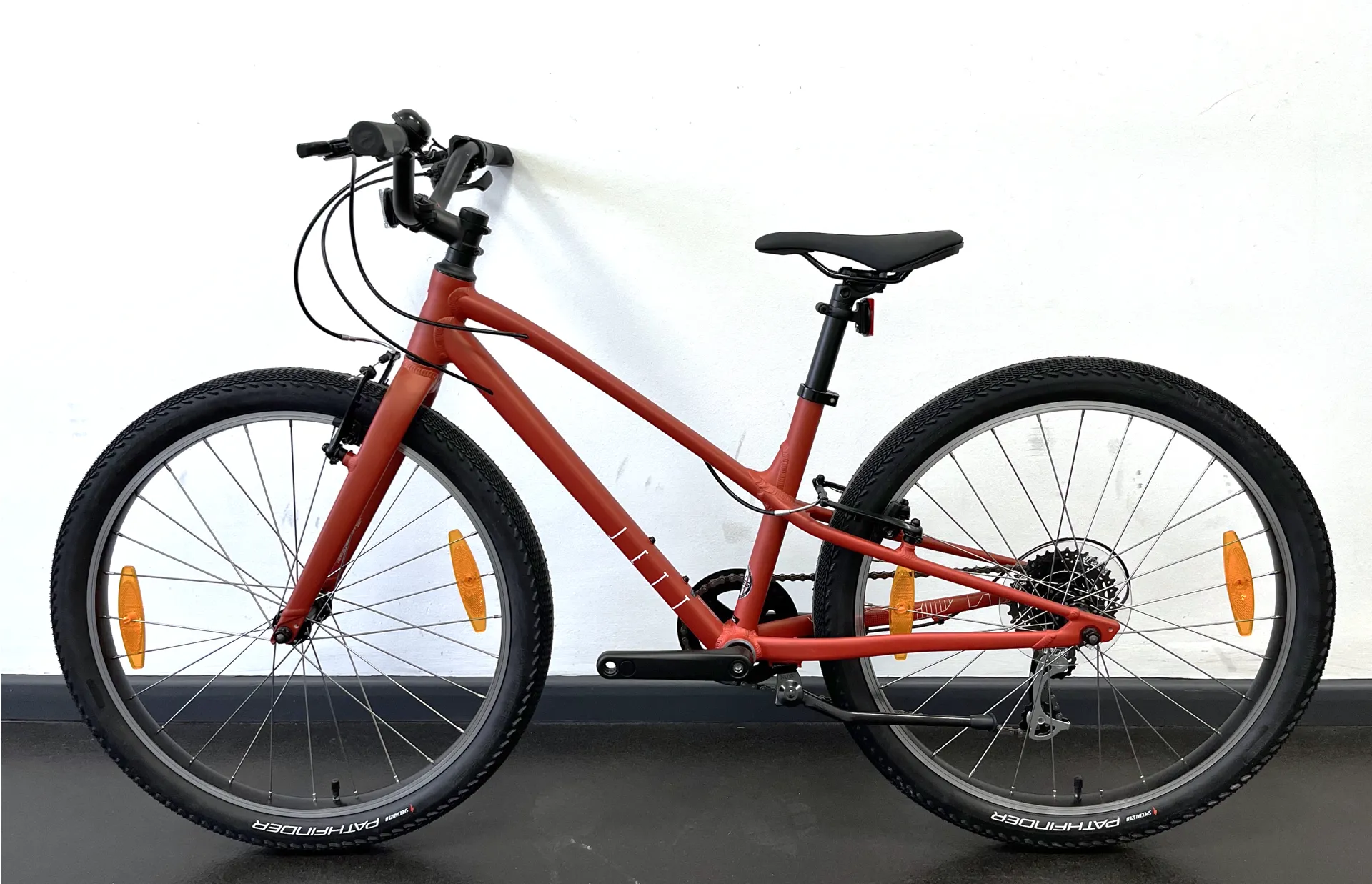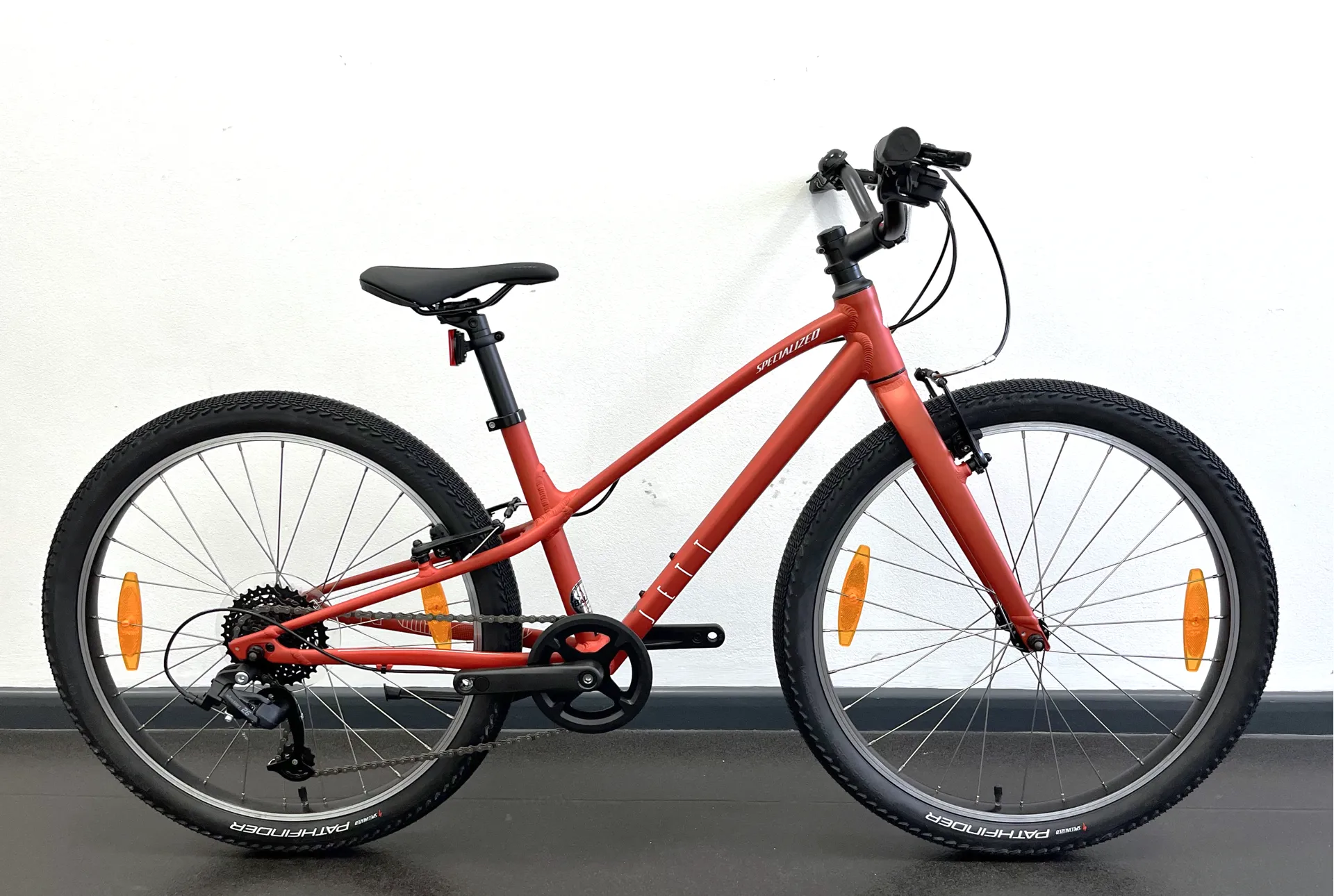 This Specialized Jett 24 inch Kids Bike is an ex-display bike, it may have some light cosmetic damage with small scratches on the handlebars, but otherwise the bike is as new. Please see photos for condition of the bike.Our ex display bikes are fully serviced and checked to ensure your riding experience is the same as a new bike - we offer full manufacturers warranty on all our ex display and ex demo bikes.Kids move fast, and grow faster. At times, it can seem like there’s a small window for the perfect bike fit. The right bike for a young rider is a delicate balance between too small, too big, and a short-lived just right. If we’re going to inspire the next generation of riders, we need to keep kids comfortably riding longer. Specialized designed the Jett Multispeed to be uniquely adjustable with 2-hole position cranks, adjustable handlebars, and longer seatposts so kids can dial-in the perfect riding position as they grow. Every detail of the Jett Multispeed—including the 130mm Bridge saddle, narrower-diameter grips, and short-reach, tool-less adjustable brake levers—was informed by Retül data from a kids’ research group to be perfectly proportional for young riders. A lightweight bike is simply more fun and the Jett Multispeed’s all-new A1 aluminium frame, alloy fork, Pathfinder tires, and 8-speed drivetrain make it one of the lightest kids’ bikes on the market.