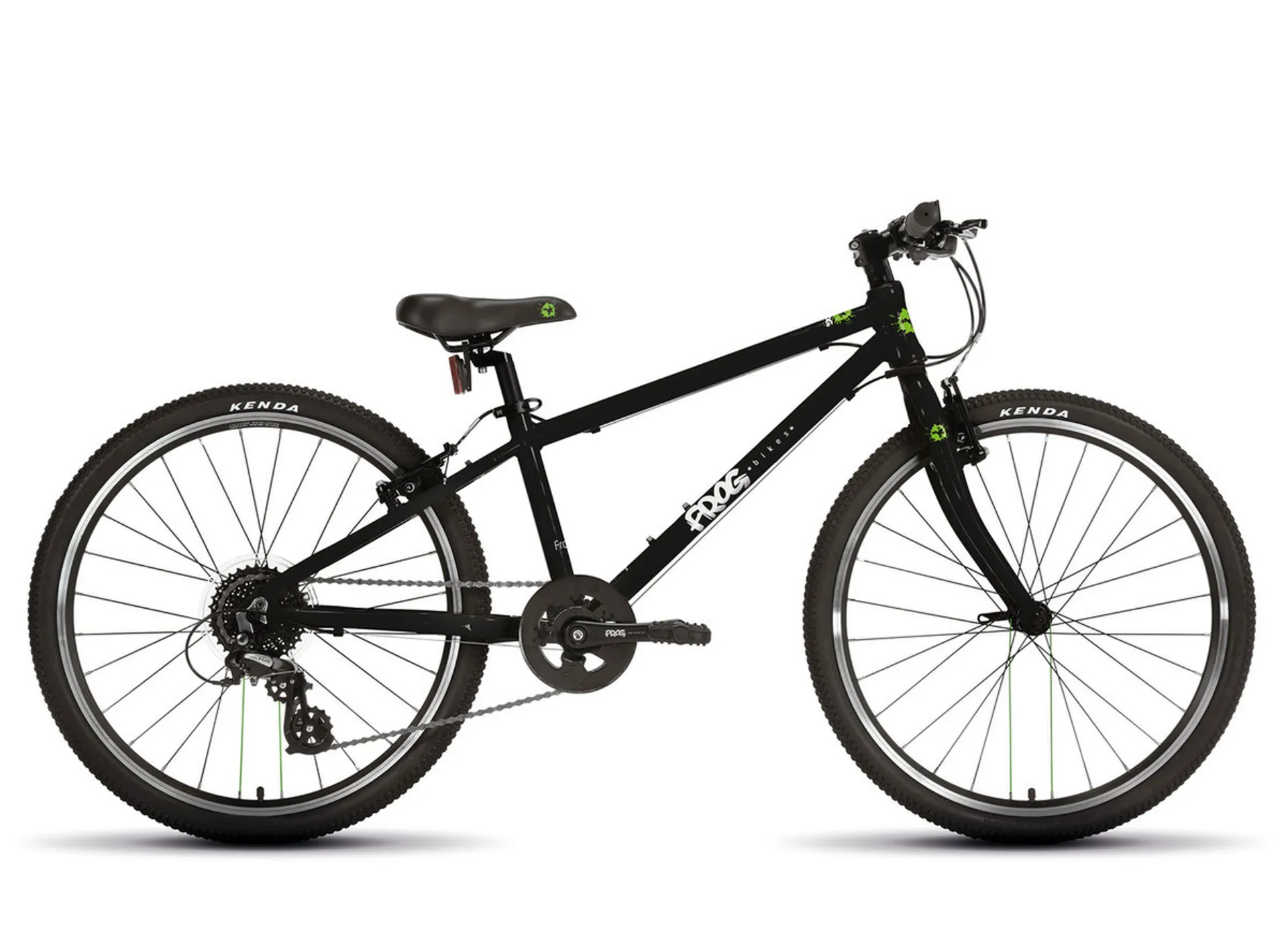 The 24-inch hybrid Frog 61 kids’ bike is the ideal multi-purpose geared bike, suitable for 8-10-year-olds with a recommended inside leg measurement of 57cm-74cm. This premium hybrid children’s bike has a lightweight, sturdy aluminium frame, weighing 9.05kg making the bike easy to manoeuvre on roads, pavements, towpaths and forest trails. It comes with Kenda small block eight tyres for maximum stability and grip, full-length mudguards and the option to attach a pannier rack to the frame, for transporting school books and sports equipment.The Frog 61 kids’ bike is equipped with age-specific components, including a quick-release child-specific saddle for the perfect riding position and FrogFit Technology® youth-specific 8-speed gear shifters with short lever travel and ultraslick cabling making changing gear and undulating rides a breeze. The bike also comes with Tektro brakes with small, easy-to-reach brake levers, which means better control and improved confidence for young riders. And, our patented Frog cranks, for more effortless pedalling, which reduces the distance between the pedals increasing efficiency and comfort for children.The Frog 61 is designed for longevity and has been optimised to help maximise the lifetime of the bike for a growing child. It offers a lower bracket position to ensure a safer more ergonomic riding experience, which also allows for a greater leg-length range to be accommodated, perfect for growing legs. And the handlebar height can be adjusted within a 40mm range, as a child grows - making it a great investment!The design of this new model has been improved so a growing child can use the bike for longer. Riders will also notice it is easier to handle because it is lighter, which reduces its environmental impact too. The new Frog 61 has undergone extensive research & development to ensure that it lasts a growing child for longer than the previous Frog 62 model. The new model is lighter than its predecessor at 9.05kgLightweighting improvements were made to the bottom bracket, crank & pedals whilst maintaining a strong and robust bikeThe bike offers a lower bottom bracket of 49mm, allowing the child to sit more ergonomically with their feet closer to the groundThe lowering of the bottom bracket also allows for a greater leg-length range to be accommodated, extending the life of the bike for the childThe Frog 61 is equipped with a kickstand mounting bracket as standardThe bike is built using the same high-quality components including the patented narrow q-factor crank to make riding more comfortable