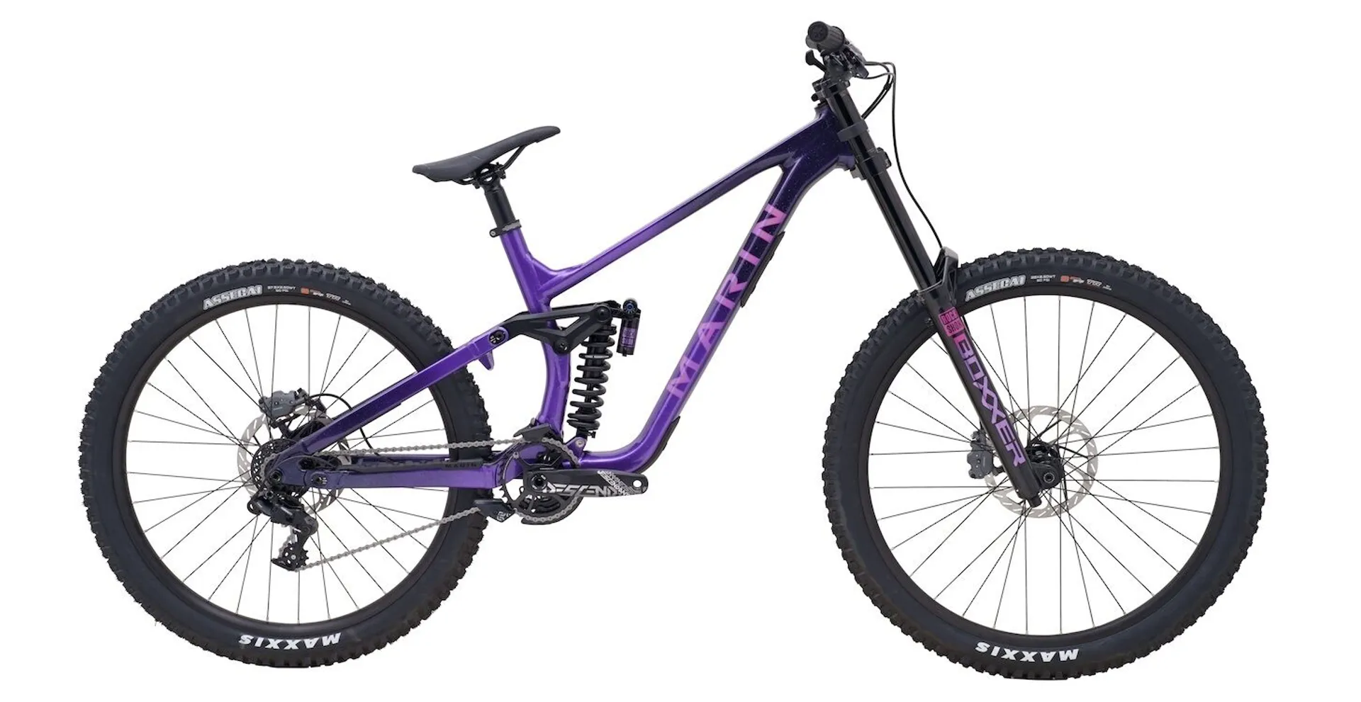 An all-new Series 4 MultiTrac 2 frame features 180mm rear wheel travel and flip chips that allow the rider to select the bottom bracket height and chainstay length, along with the ability to run a 29" rear wheel. Marin have chosen a no-nonsense build kit, starting with RockShox’s storied Boxxer fork paired with a Vivid Coil Ultimate DH shock. The Boxxer is renowned for its balance of performance and durability, and it is quickly and relatively affordably upgradable to a Charger 3 damper for riders who demand the utmost adjustability. Out back, the shock has hydraulic bottom out and adjustable low and high-speed compression damping to dial in the perfect ride. SRAM’s gravity-specific GX DH 7-speed drivetrain has the tight range needed in gravity applications, while powerful Maven Bronze four-piston brakes and 200mm HS2 rotors rein speed. Maxxis DH-rated rubber and SRAM’s venerable Descendant crankset, handlebar, and direct-mount stem round out the stout parts mix, designed for long life in some of the harshest riding conditions.