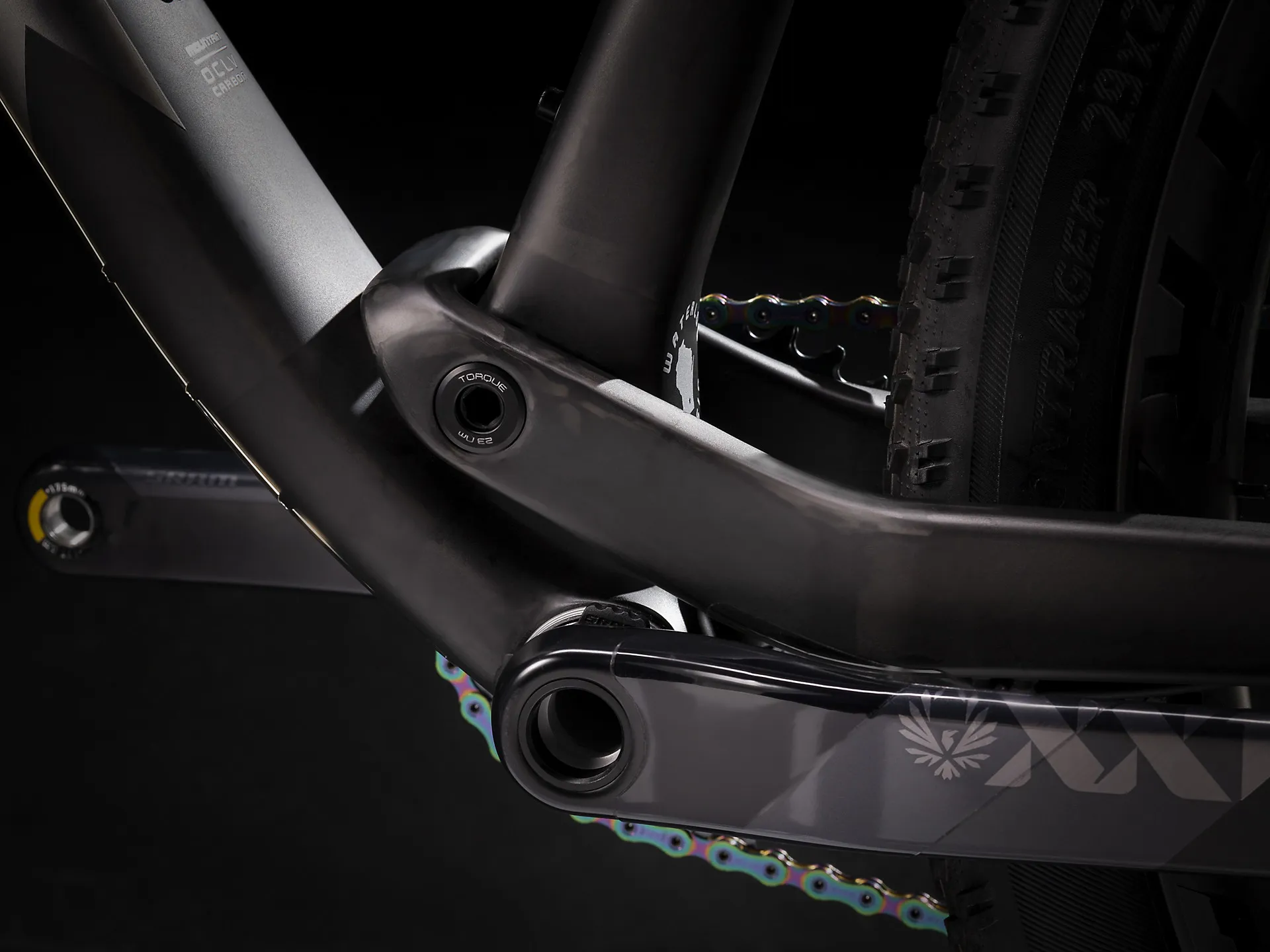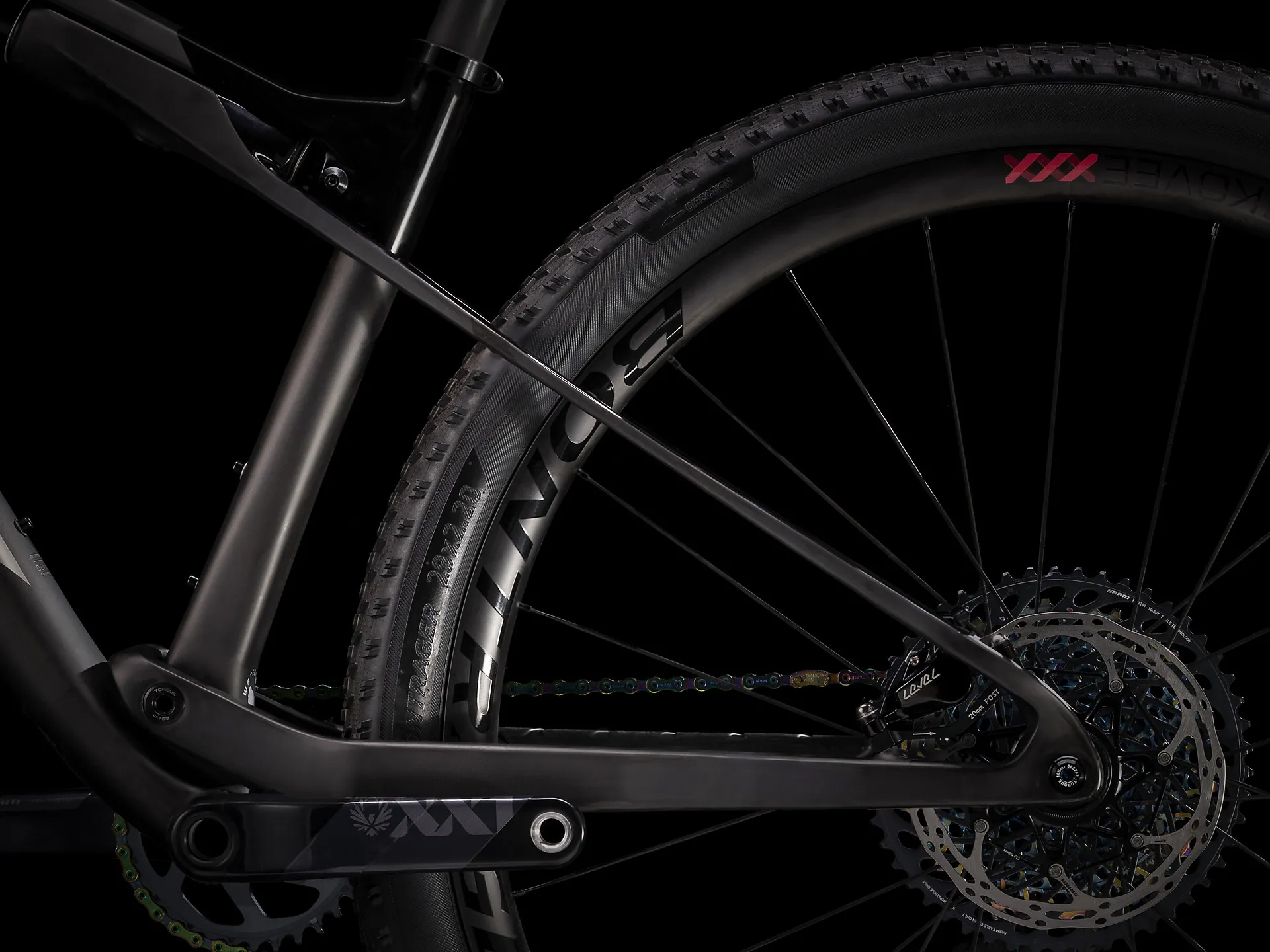 Rims: Bontrager Kovee XXX 30, OCLV Mountain Carbon, Tubeless ReadyBontrager Line DH 30, Tubeless Ready, 6-bolt, 110x20 mm Boost thru axle