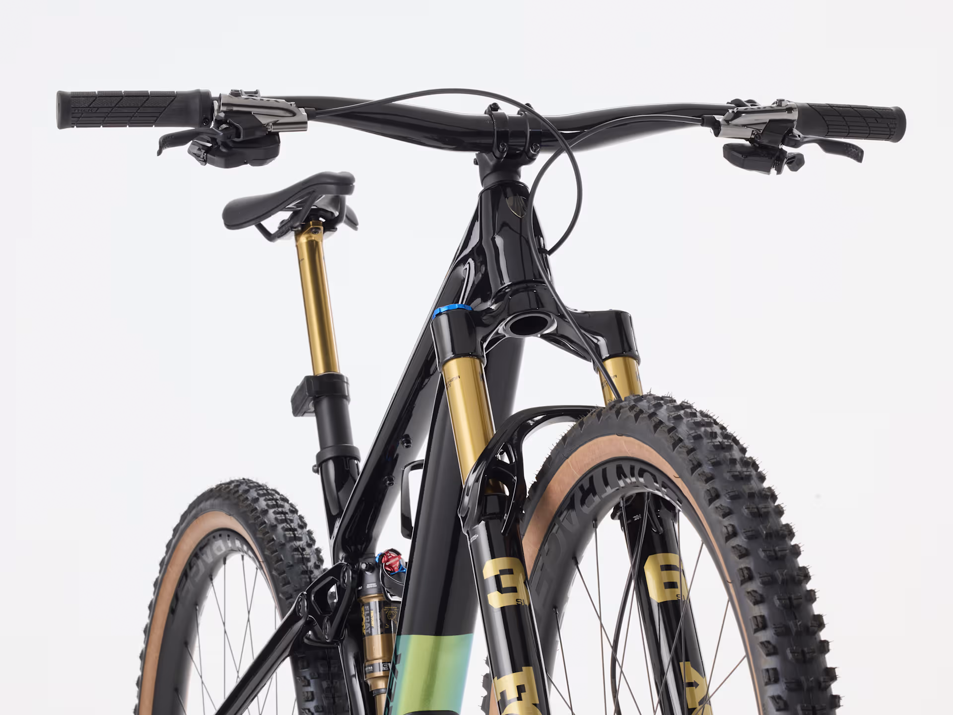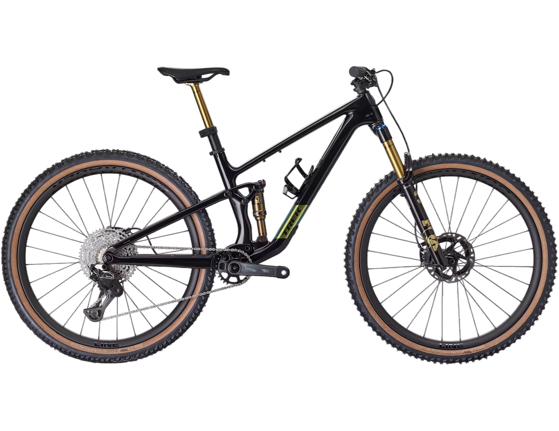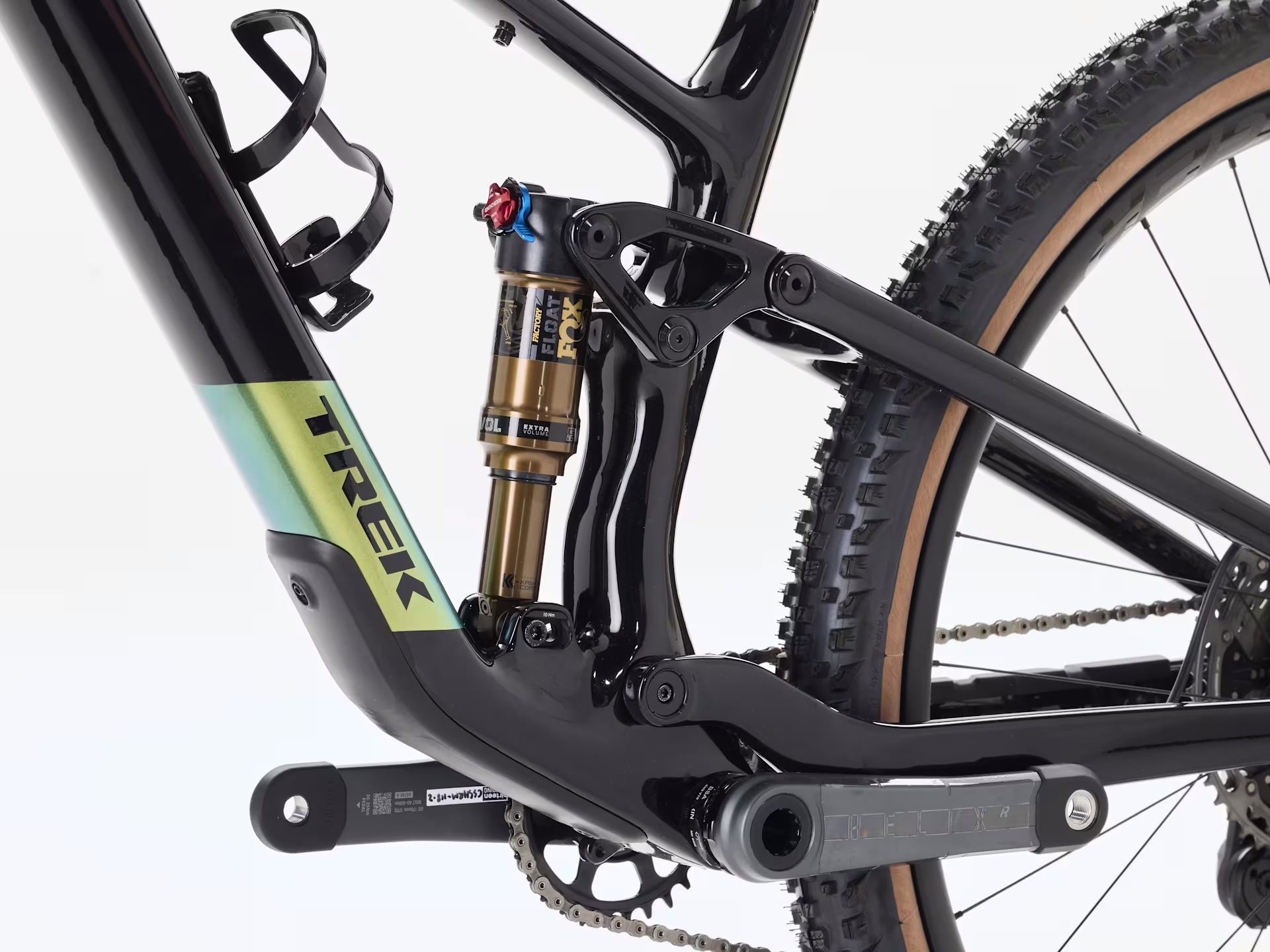 An OCLV Mountain Carbon frame with a 4-way Mino Link lower shock mount for tweaking geometry and suspension leverage rate. A 130 mm fork, plus 120 mm of rear travel from a Fox Factory Float shock. Shimano’s all-new XTR Di2 12-speed drivetrain, Shimano XTR M9220 hydraulic brakes, Bontrager Line dropper post and tubeless-ready Bontrager Line Pro 30 OCLV Carbon wheels.