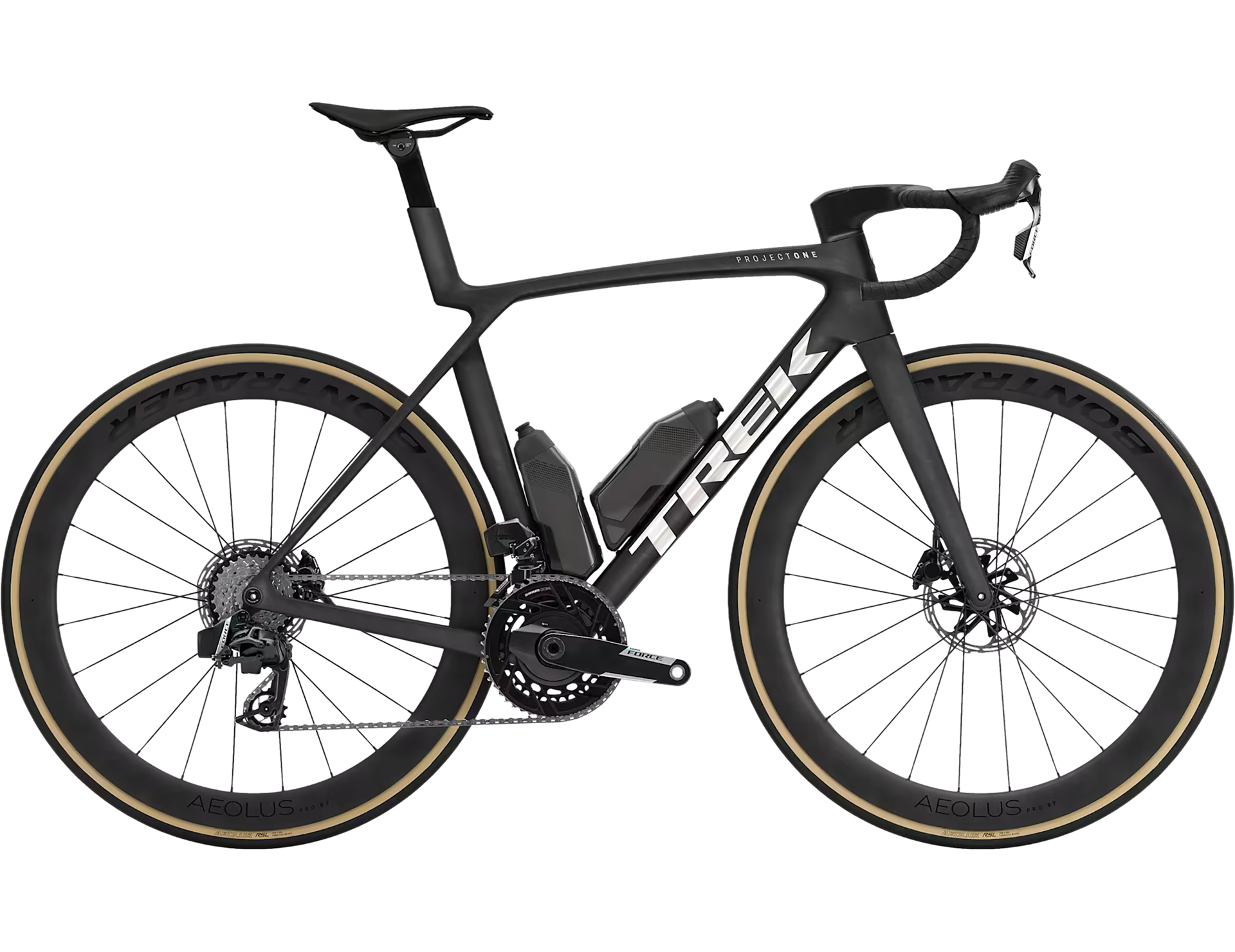 An insanely light frame made of Trek's highest-level 900 Series OCLV Carbon with aero tubing and IsoFlow comfort technology, and RSL Aero Bottles and Cages that save watts. A 2x12 SRAM Force AXS E1 wireless electronic drivetrain with a power meter for getting more out of training. A universal derailleur hanger so you can get a replacement from anywhere. Plus, it's topped off with Bontrager Aeolus Pro 51 tubeless carbon wheels and a Trek Aero RSL one-piece bar/stem.
