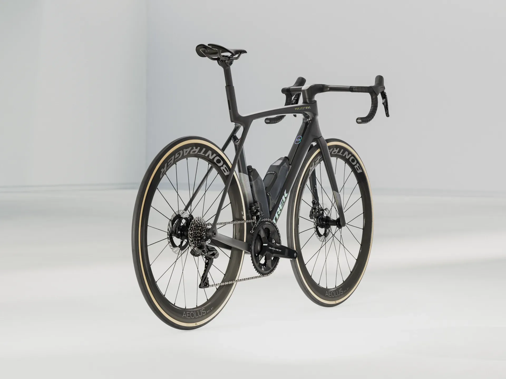 An insanely light frame made of Trek's highest-level 900 Series OCLV Carbon with aero tubing and IsoFlow comfort technology, and RSL Aero Bottles and Cages that save watts. Shimano's top road group set – Dura-Ace Di2, for lightning-fast shifts that you can customise. A universal derailleur hanger so you can get a replacement from anywhere. Plus, it's topped off with Bontrager Aeolus RSL 51 tubeless carbon wheels and a Trek Aero RSL one-piece bar/stem.