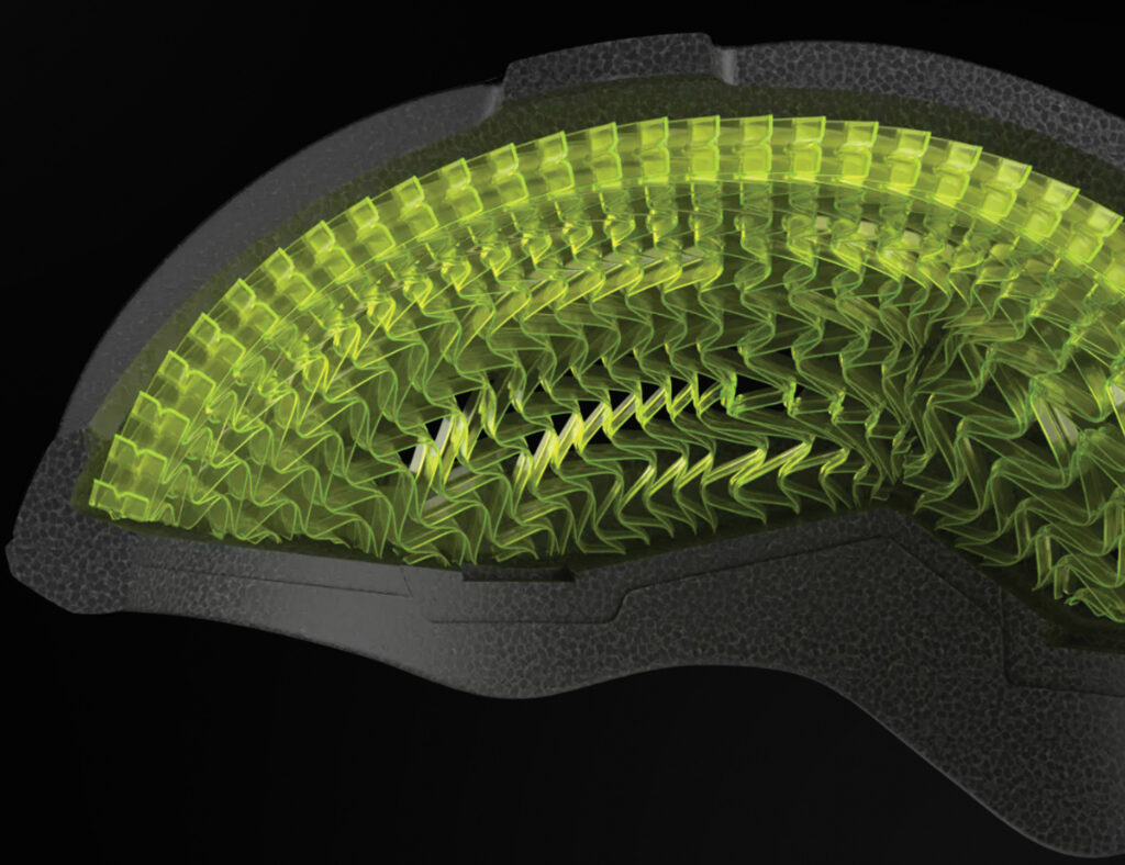 Trek and Bontrager’s honeycomb-like liner that flexes, crumples, and glides in stages to manage both linear and rotational forces.