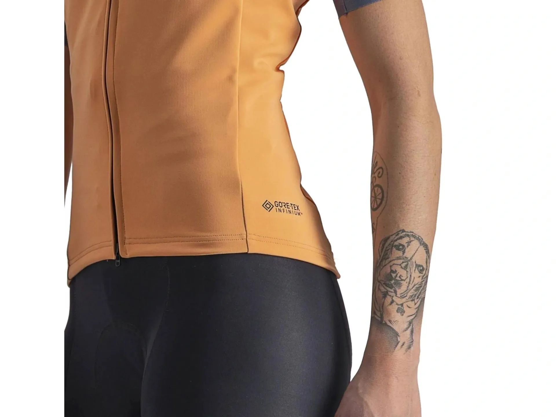 The resulting vest is composed of a mixture of GORE-TEX INFINIUM™ WINDSTOPPER® 203 Stretch fabric at the front and sleeves, offering windproofing with breathability, and stretchy Nano Flex fabric at the back, which is water repellent and lets in enough wind to let you stay dry, without getting cold.