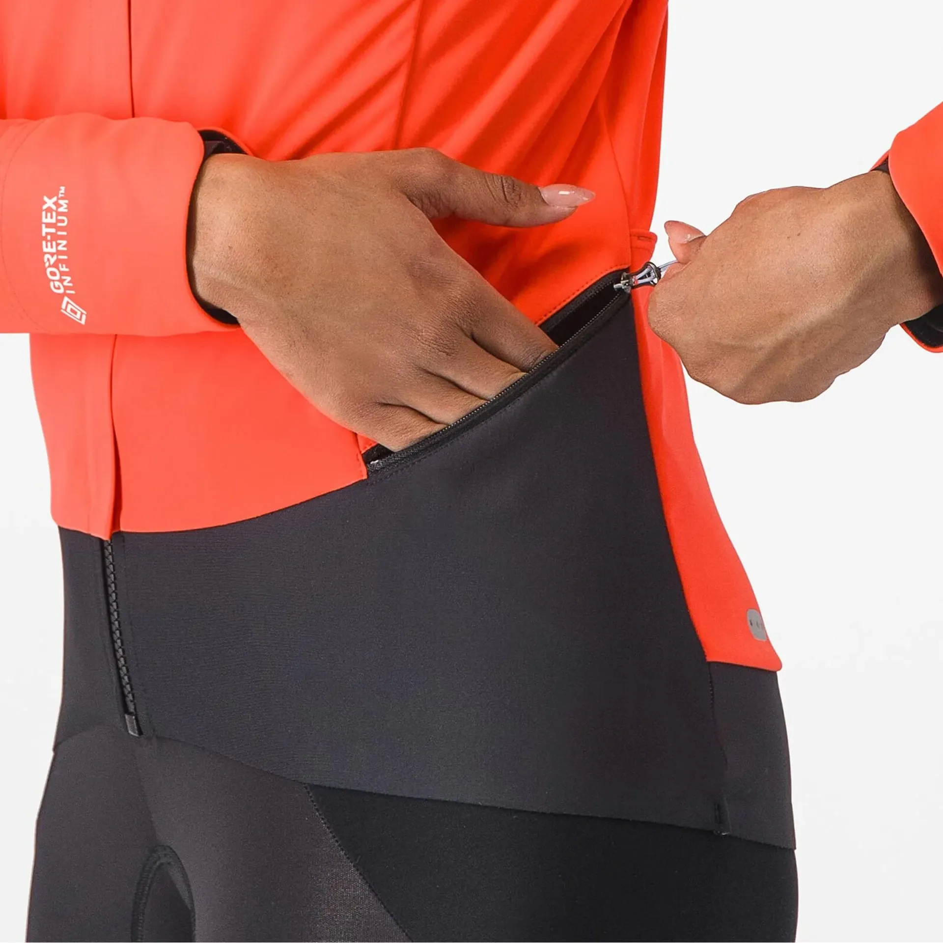 The outer layer is about as protective as you can get without sacrificing breathability, being fully waterproof and resistant to light rain and spray. Made of Gore-Tex Infinium™ Windstopper® 150, it is punctuated by a large, covered vent on the upper back and a smaller vent in a zipped pocket on the front, to let heat and moisture escape, so that you won't end up with that boil-in-the-bag feel.