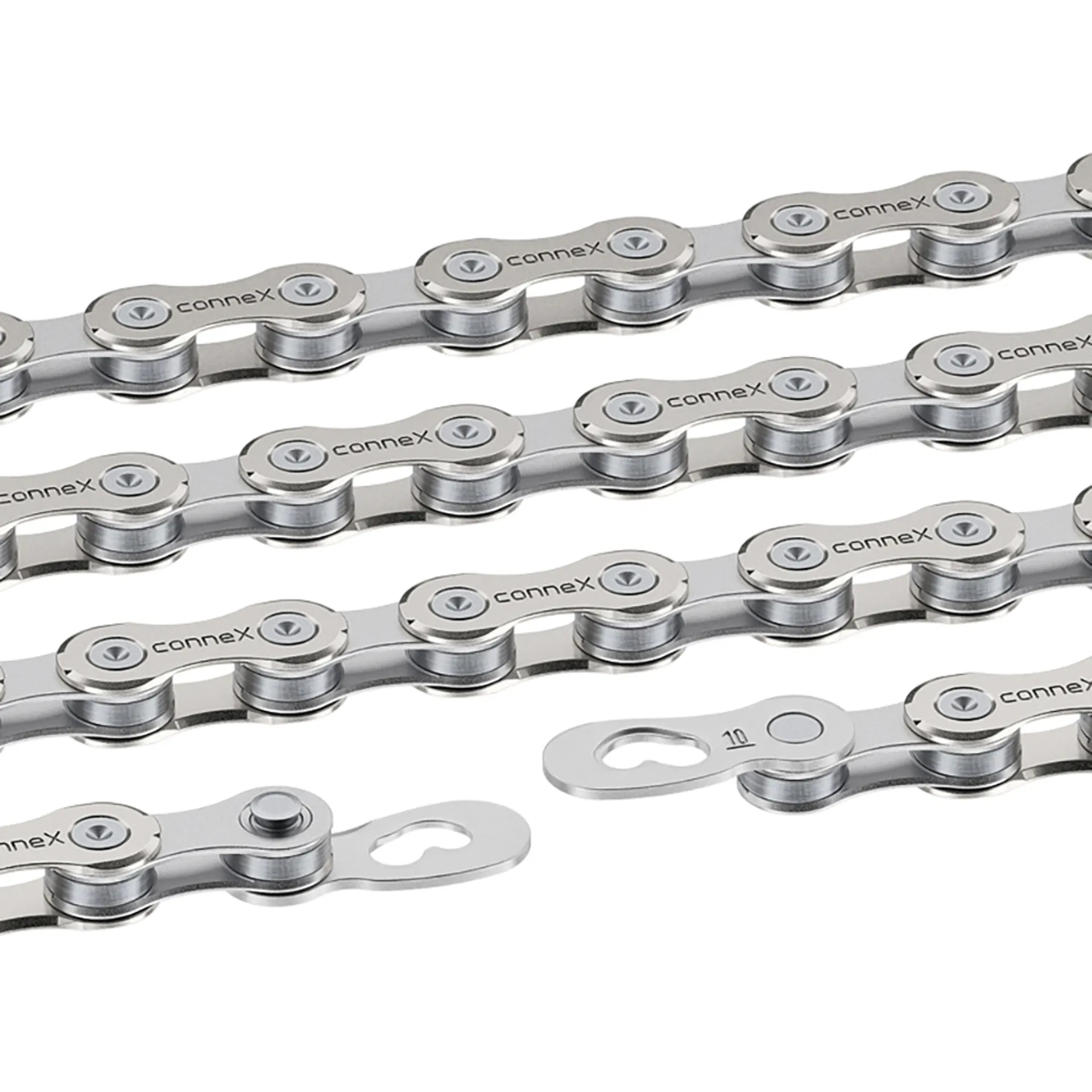 Connex 10SE Bicycle Chain 124 Link 10-Speed Stainless Rollers and Inner Links Nickel Plate