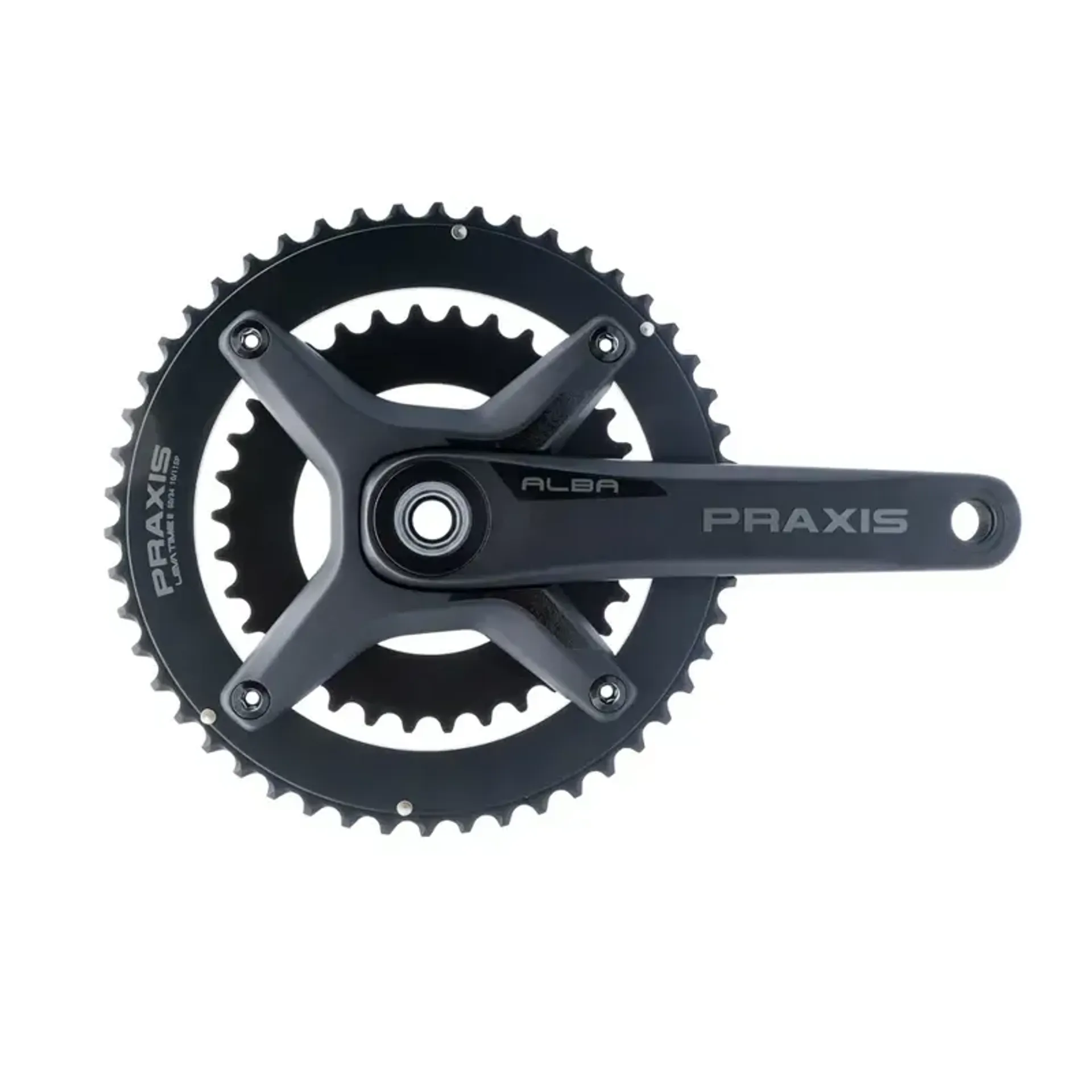 The Praxis Alba DM X Crankset is inspired by the challenging Alba road climb in Santa Cruz. It features shapely forged-alloy arms, an M30 alloy spindle, and the LevaTime II X-spider and rings, making it a versatile choice for various road cycling conditions.