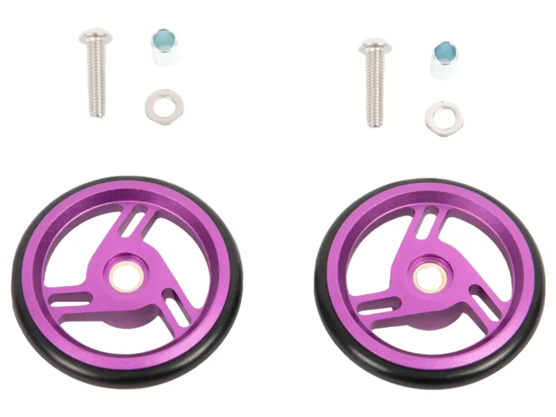 Each set includes two aluminium wheels and fixings, with bushings included and bearings not included.