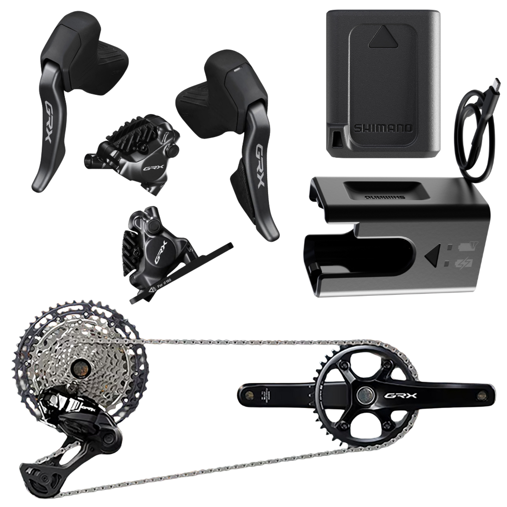 - Right Front STI Lever and Calliper: Shimano ST-RX825 GRX Di2 12-Speed STI Bled with BR-RX820 Calliper Right Front