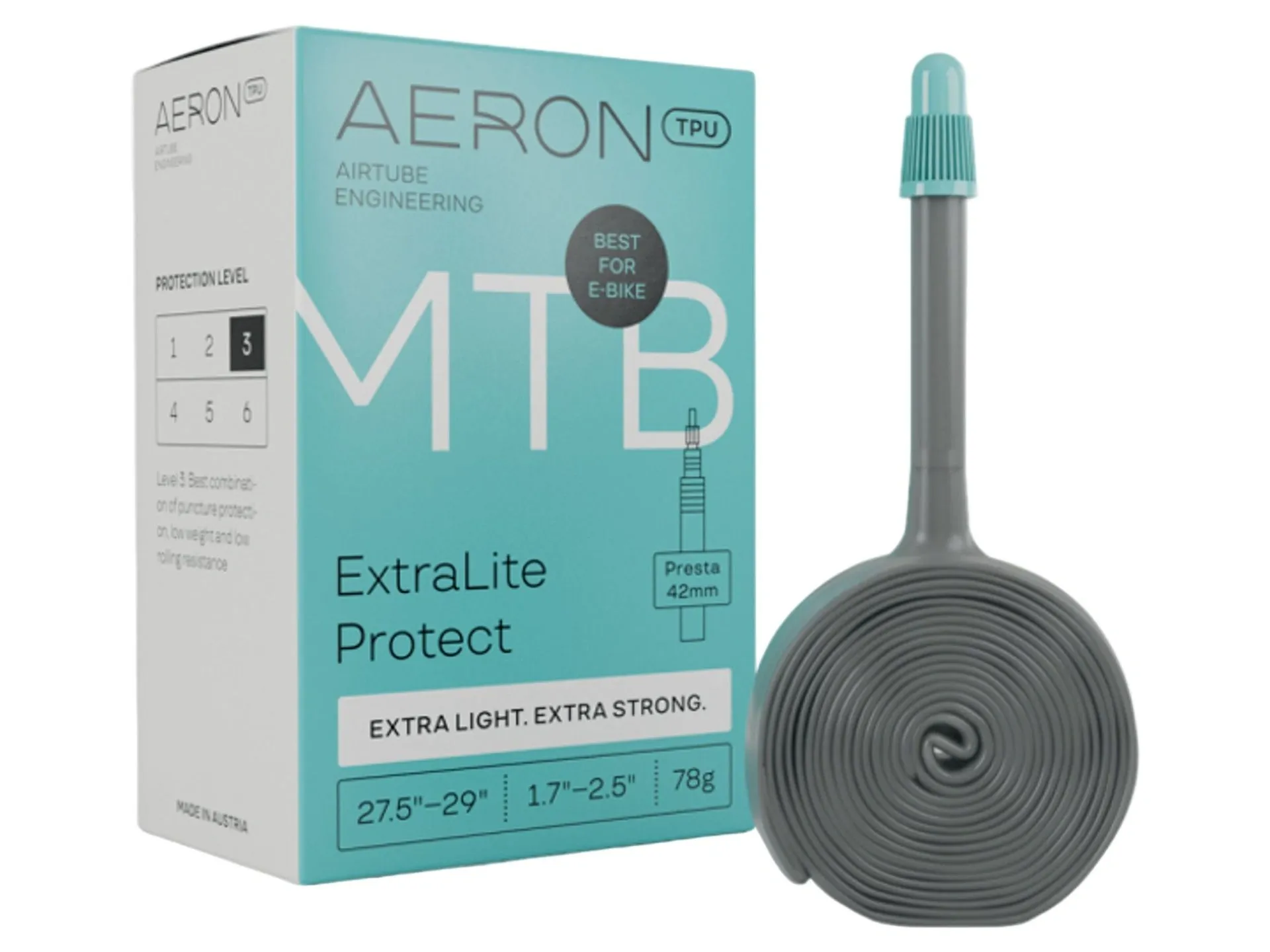 The Aeron Tpu MTB ExtraLite Protection tube is designed for alpine crossers, offering a balance between puncture protection and performance. It is suitable for rough terrain and features a 78g weight with a 42mm valve.