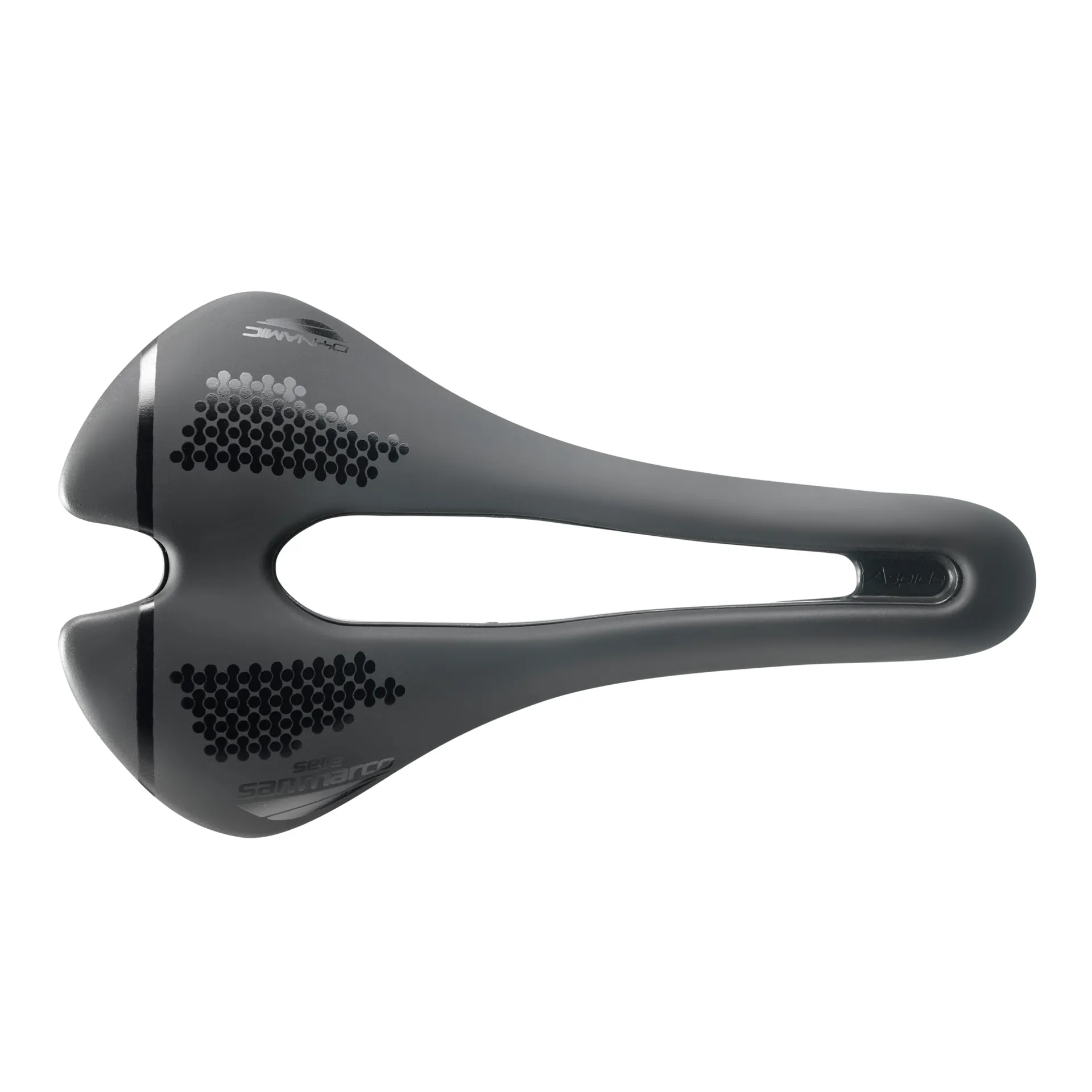The Aspide Short resumes the essential shape and the unmistakable design, which has always characterized the Aspide range, but shortens its length (250mm) to make it an even more comfortable. Its shape, combined with the large central cut-out (open-fit), guarantees maximum comfort and adequate support of the ischiatic bones in different pedalling situations.