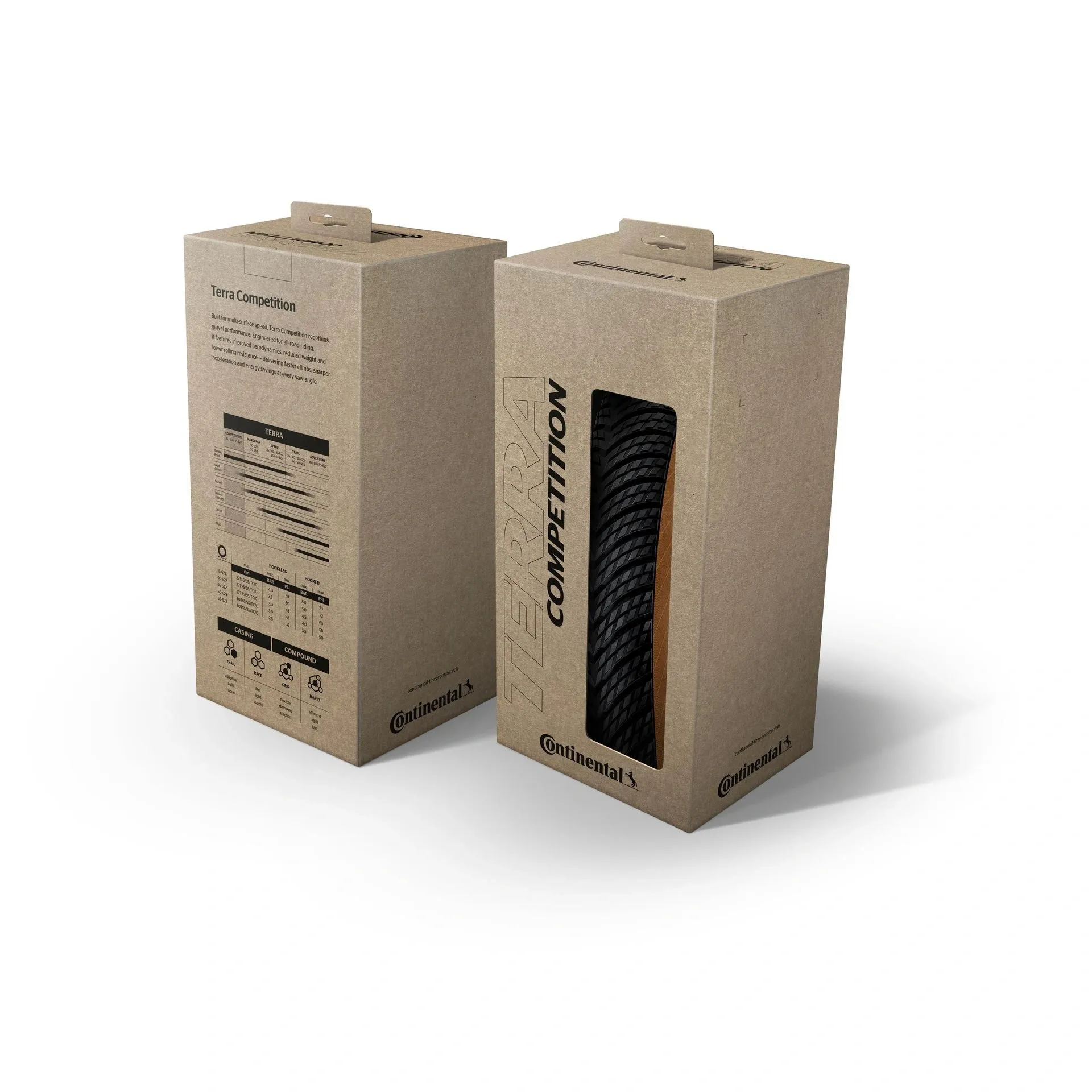 The Continental Terra Competition Race Rapid is built for maximum speed and acceleration across mixed-surface terrain. Developed for riders who refuse to compromise on performance, it combines a lightweight construction, low rolling resistance, and aerodynamic efficiency inspired by Continental's road racing technology. Designed for fast gravel and all-road use, it delivers sharp responsiveness and energy savings on climbs and flats alike.