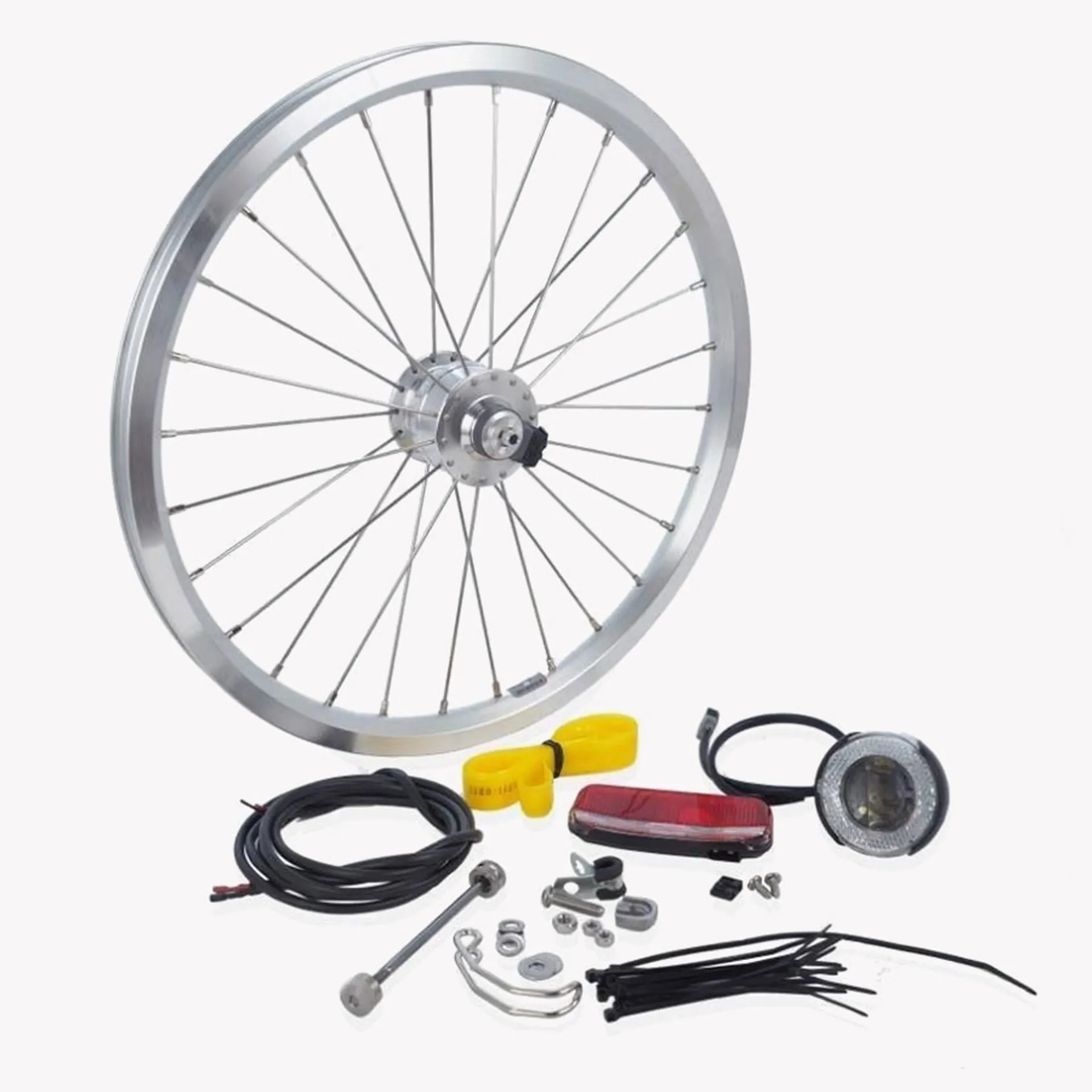 The Brompton Hub Dynamo SV8 Kit in Silver is a complete kit with a replacement 16-inch front wheel with an integrated hub dynamo.