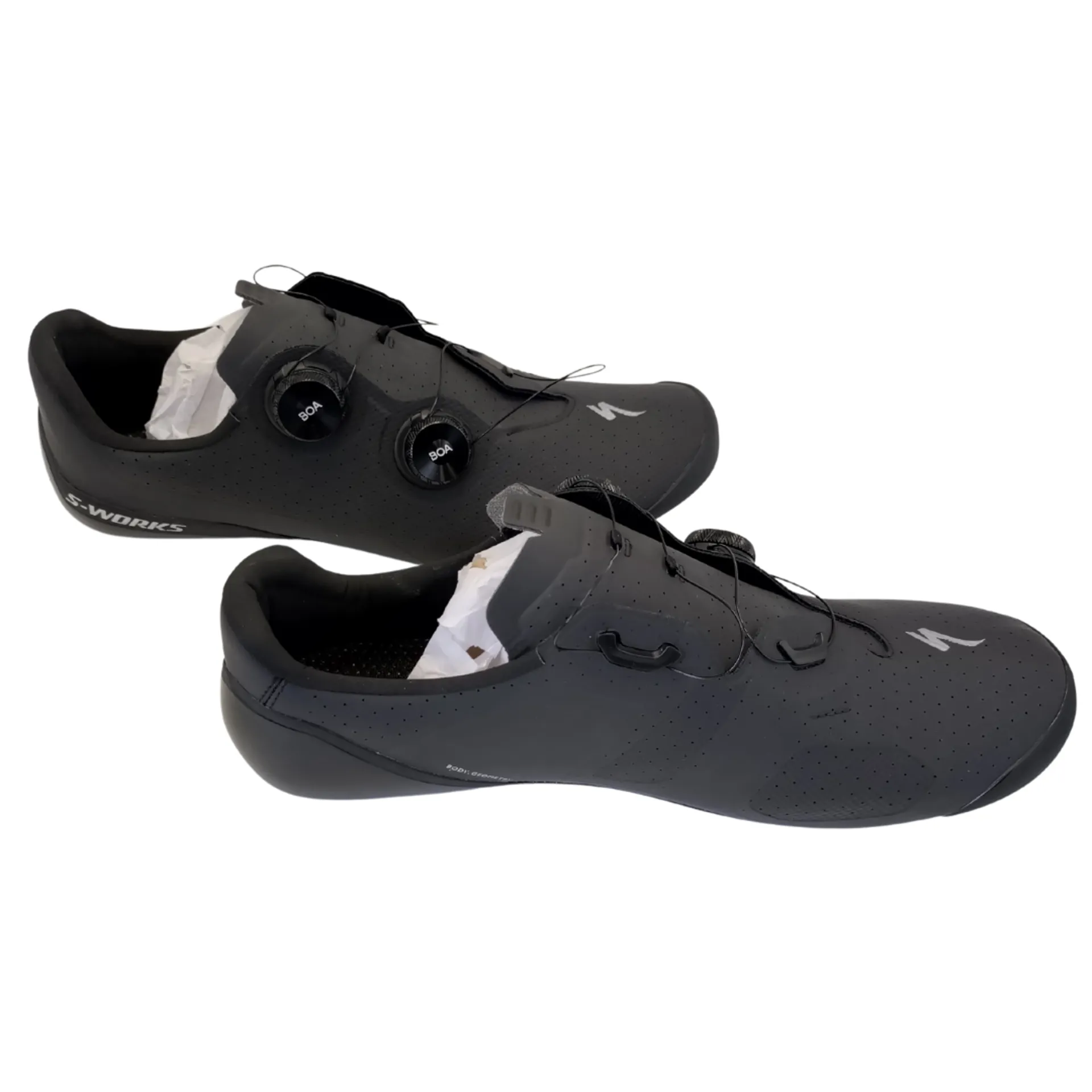 These Specialized S-Works Torch Road Cycling Shoes in 44.5 are an ex display item, they have some minor, light cosmetic damage, with scuffs on the soles but otherwise they are as new. Please see photos for condition.