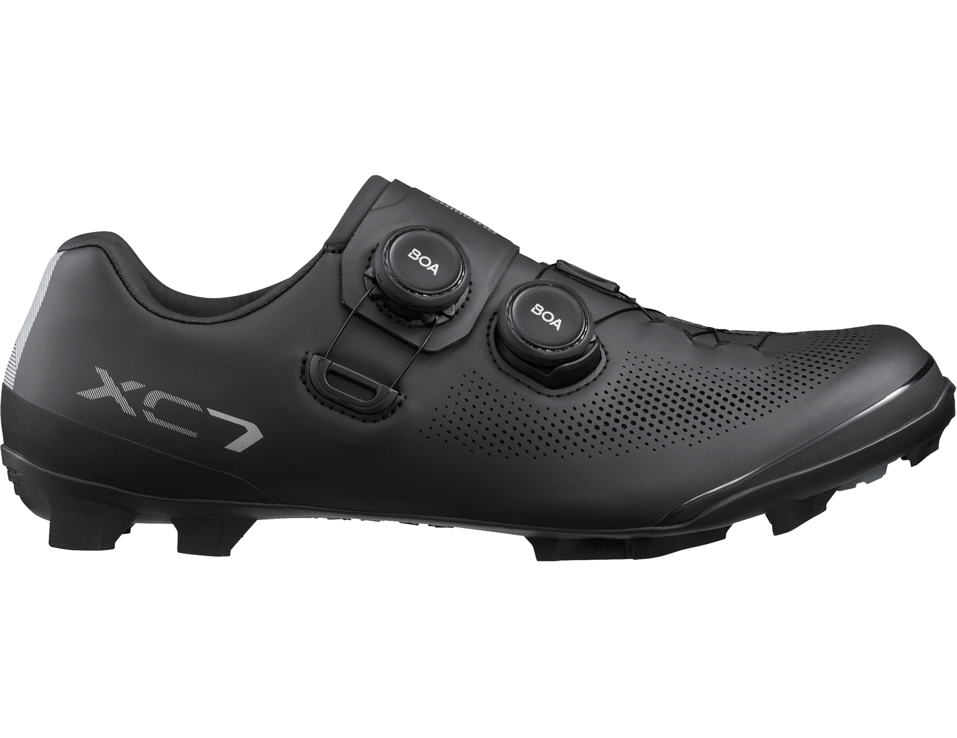 Engineered for competition and demanding XC trails, the Shimano XC7 delivers lightweight performance, precise fit, and superior power transfer. These shoes feature a carbon-reinforced midsole for rigidity and efficiency, while the BOA® Fit System with dual L6 type Z dials ensures a secure, adjustable fit. The low-profile crossover lacing pattern and surround-wrapping upper provide a glove-like fit, stabilizing the foot during aggressive riding.