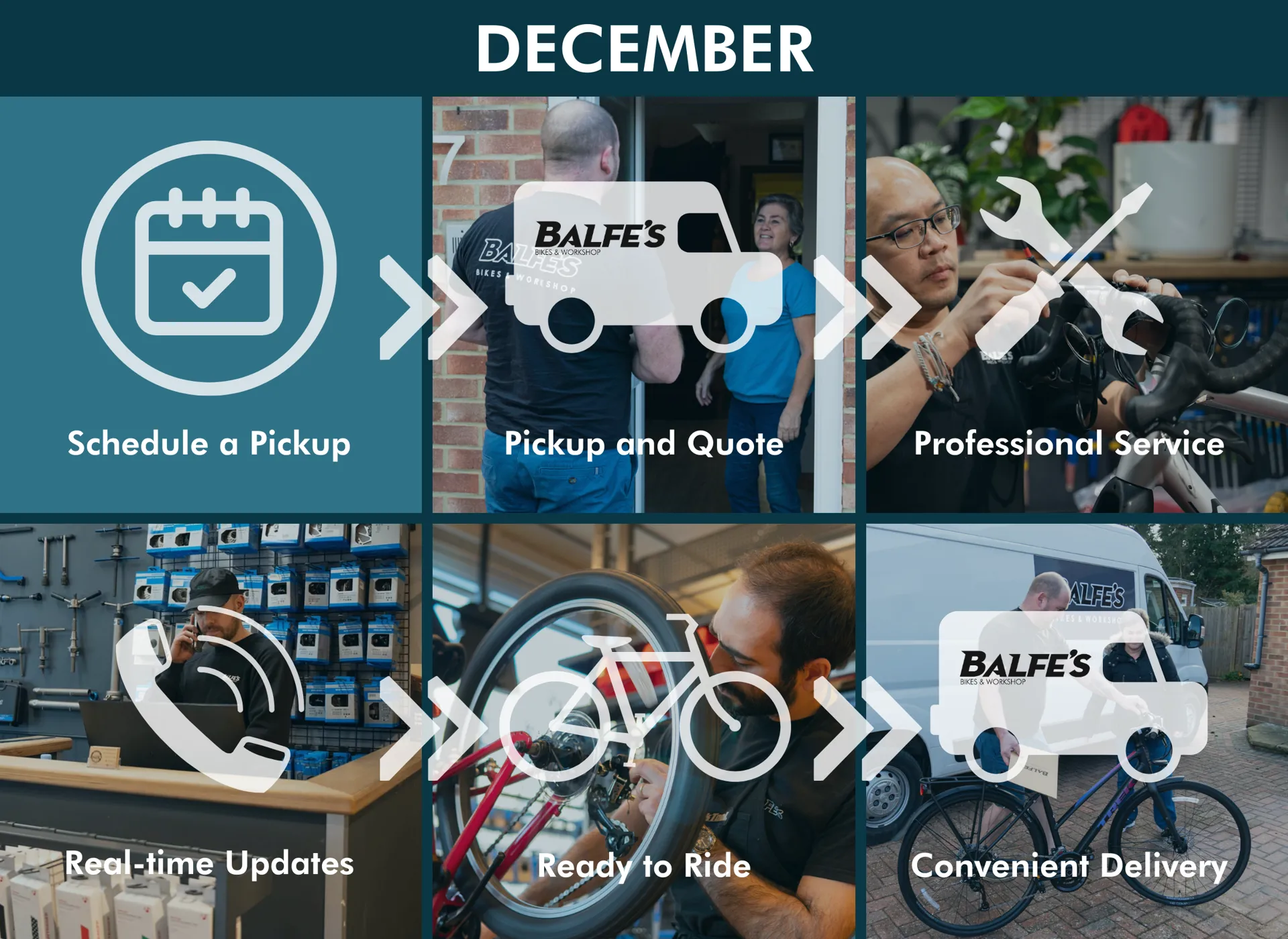 - Ready to Ride: Once the work is completed, you will be sent a remote-payment link for the cost of the service and any parts used. At the same time, the team will be in touch to pick a delivery date that works best for you.