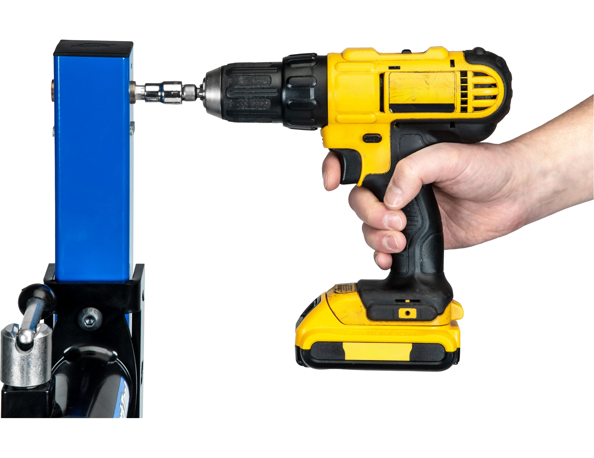 The professional-grade 100-3D clamp lowers to a height of 74 cm, allowing you to clamp onto the seat post or seat tube of most bicycles without needing to lift them into the stand. From there, the PRS-30 features 58 cm of height adjustment, elevating the bike to a comfortable position for removing wheels, tuning the drivetrain, cleaning the chain, or any other procedure. Height adjustment is accomplished using an internally-geared mechanism driven by a simple hand crank, or through the use of a common battery-operated drill with 10 mm socket for truly effortless lifting of heavy bicycles.