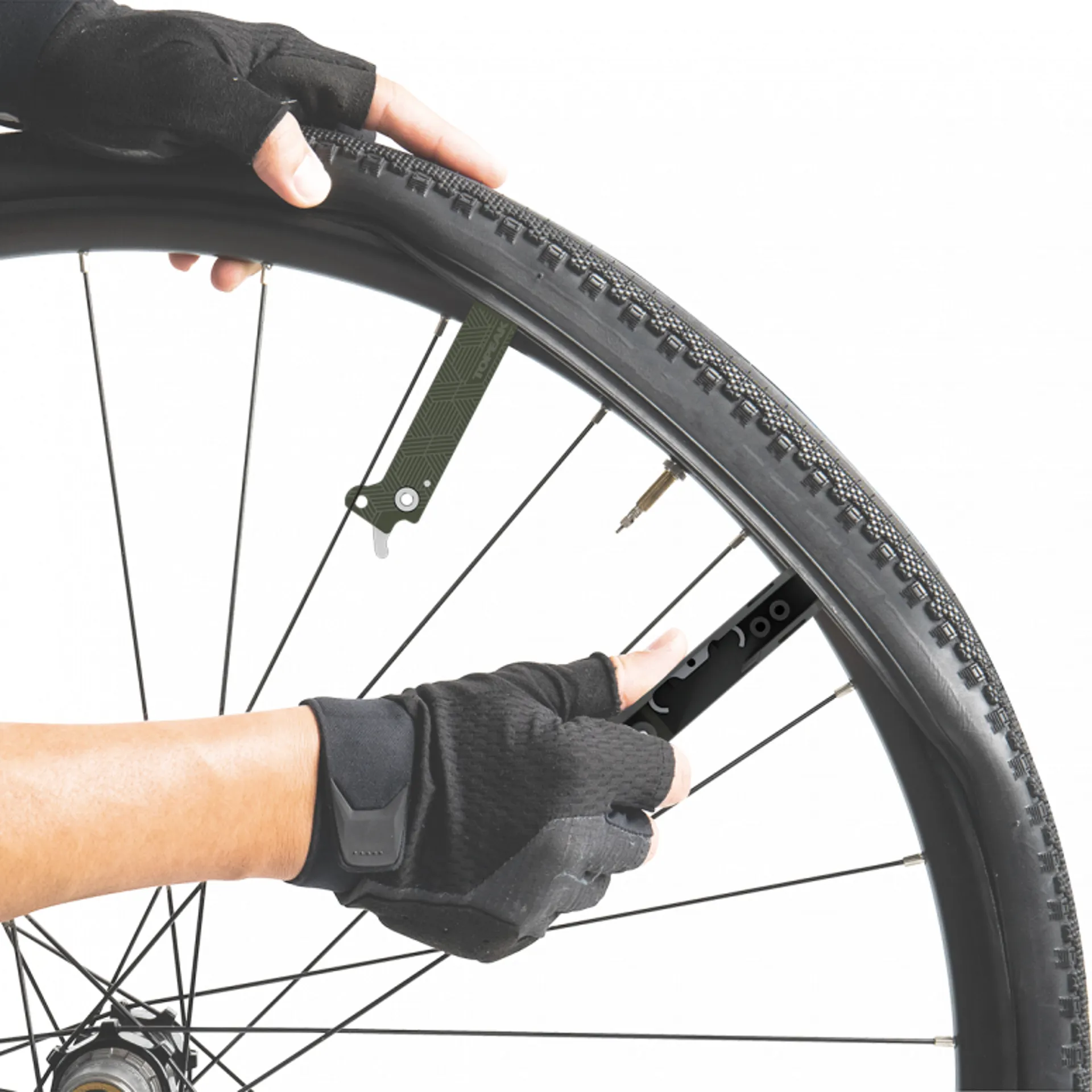 An ingenious compact combination tool of tyre levers, master link pliers and chain tool!
